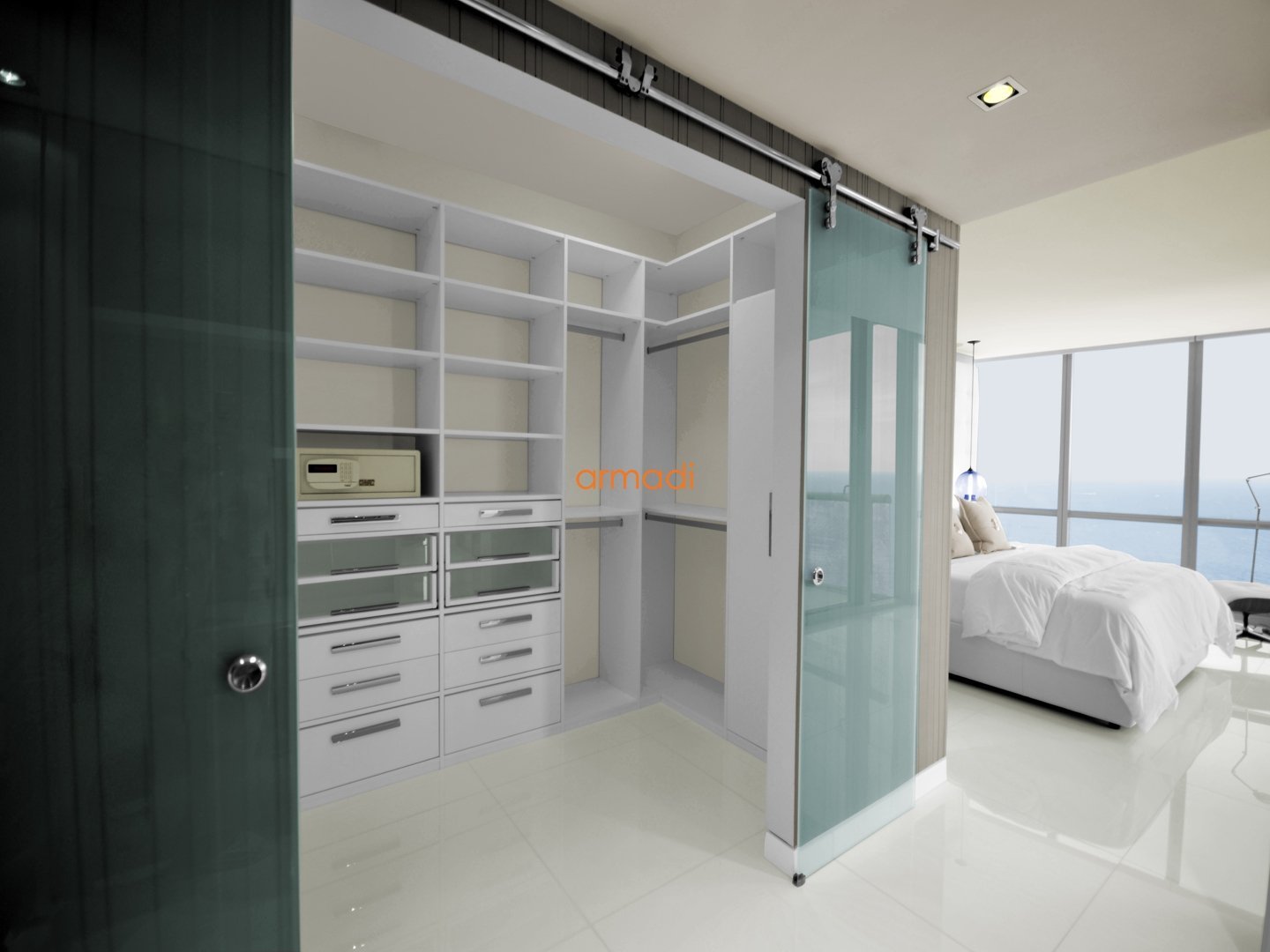 Гардеробная в спальне с раздвижными дверями угловая