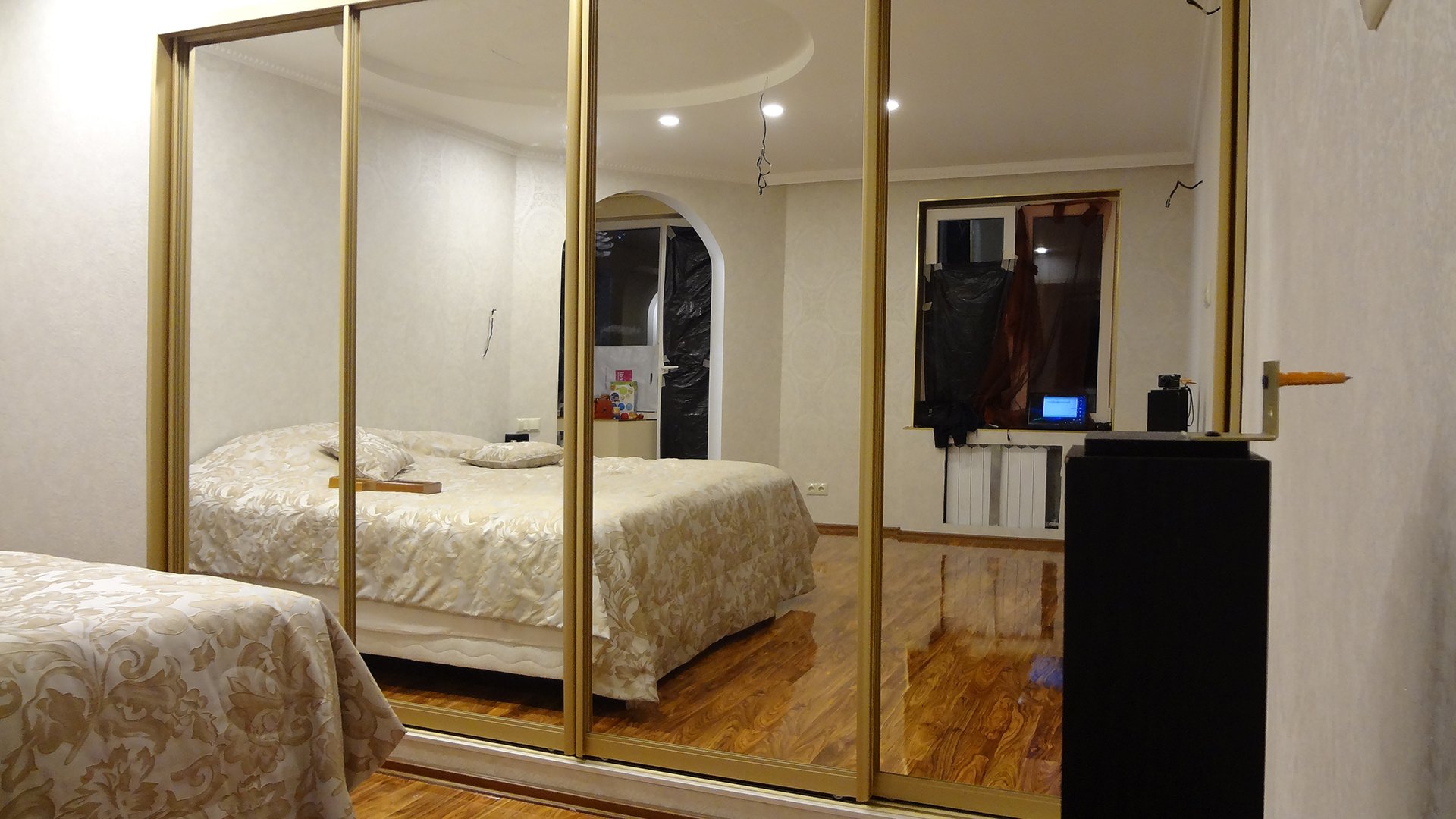 Зеркальный шкаф купе с золотым профилем