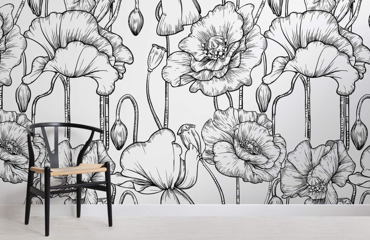 Нарисованные цветы на стене в интерьере
