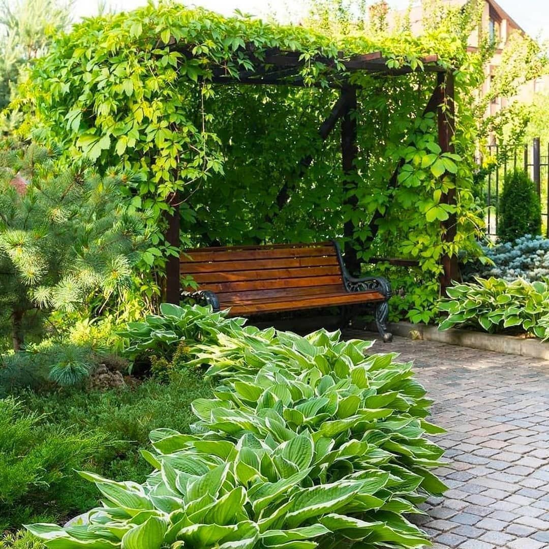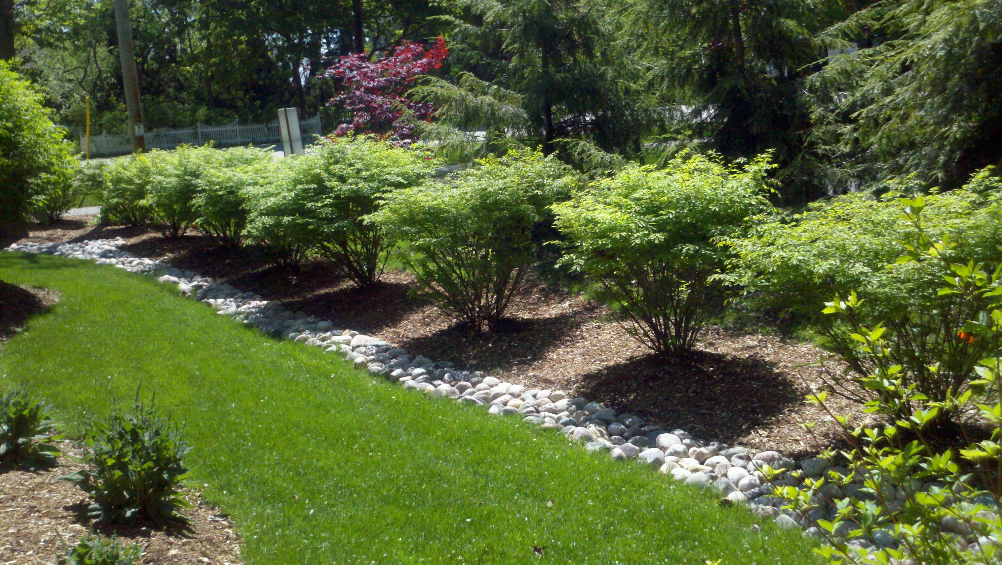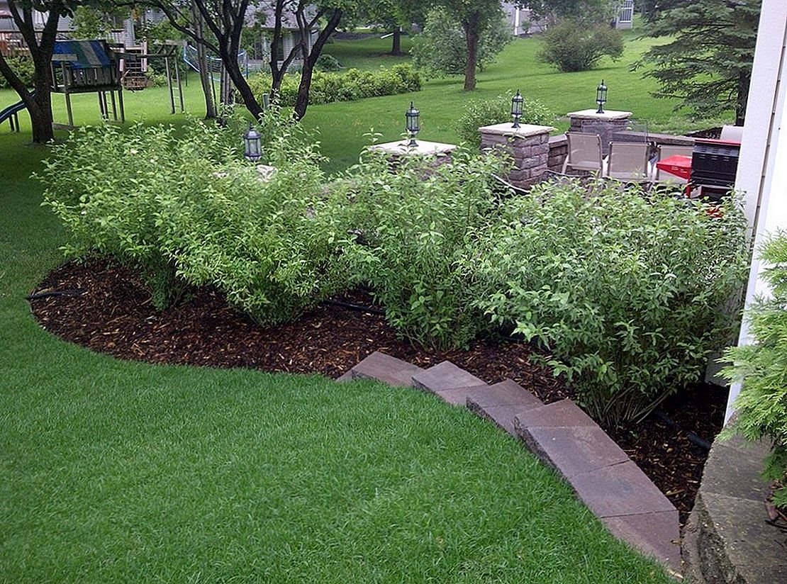 Сад с газоном и кустами