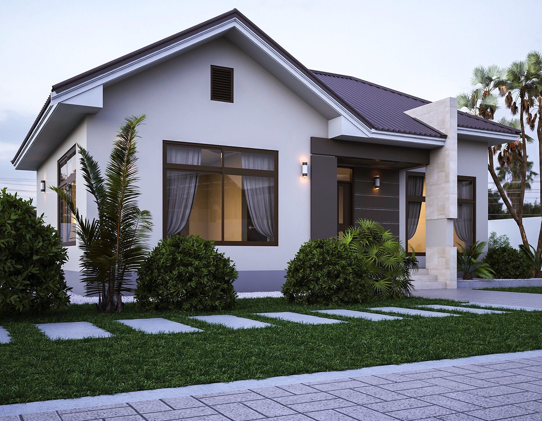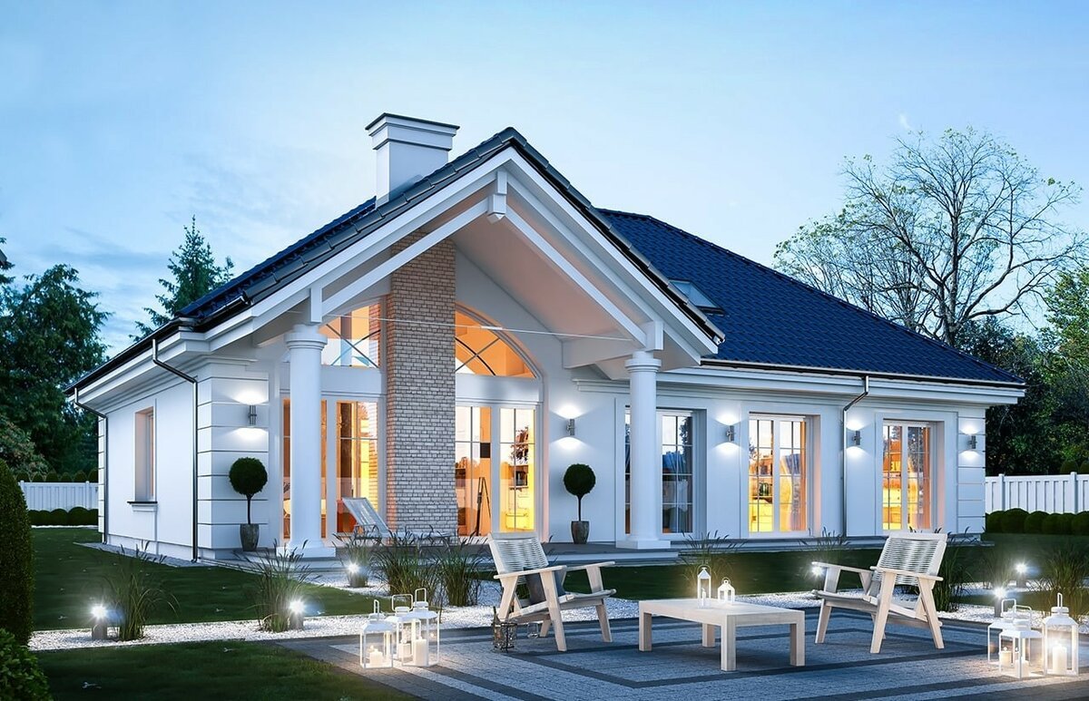 Одноэтажный дом с белым фасадом