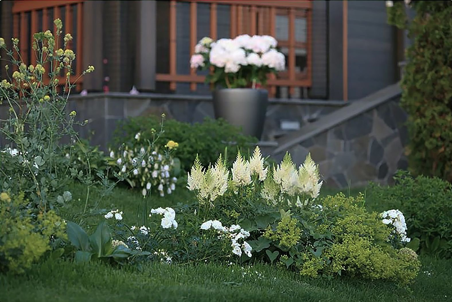 Дизайн цветника перед домом с горкой