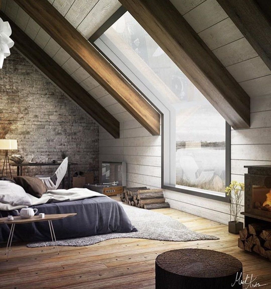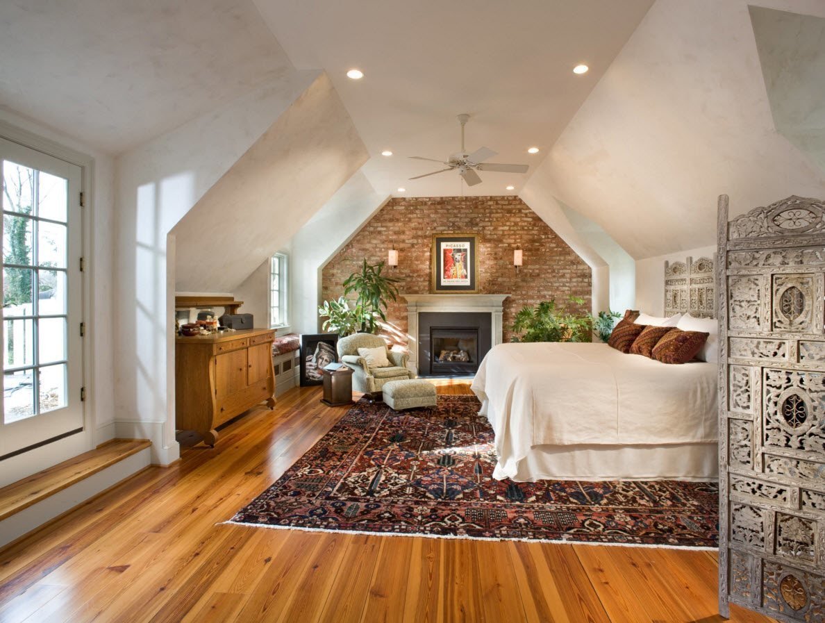 Спальня на мансарде с камином