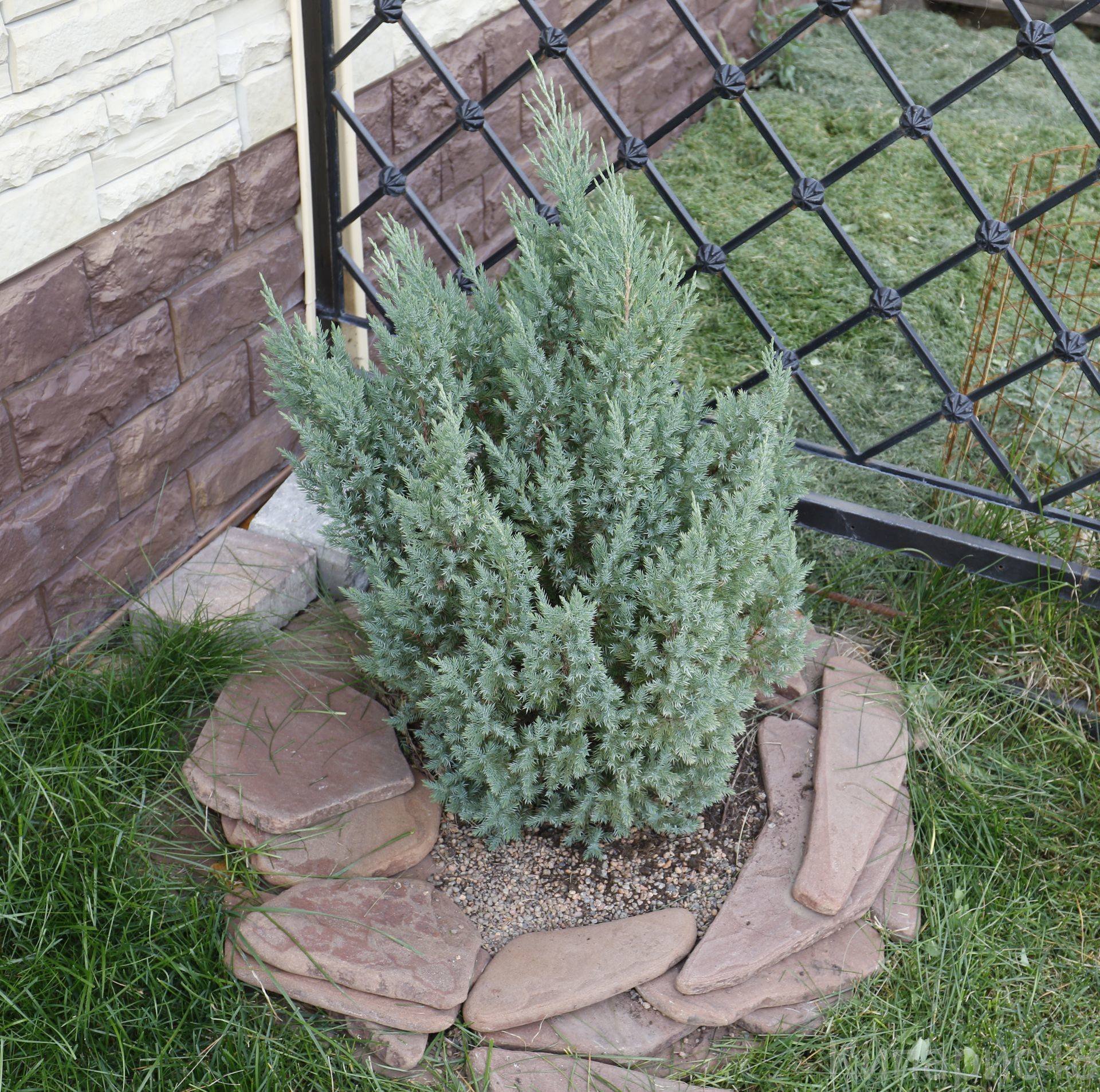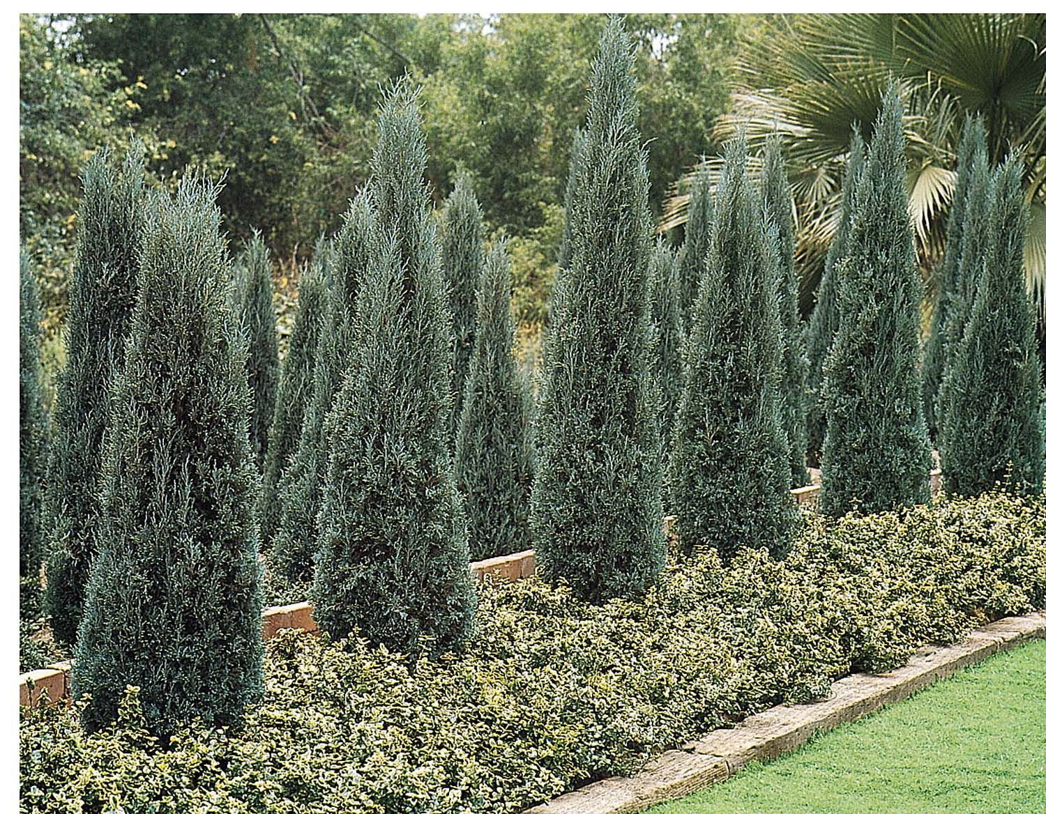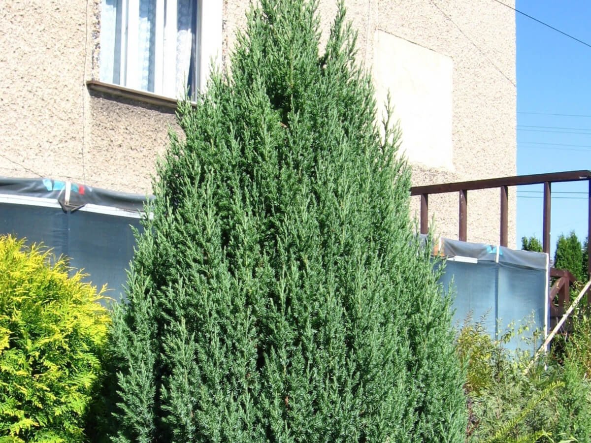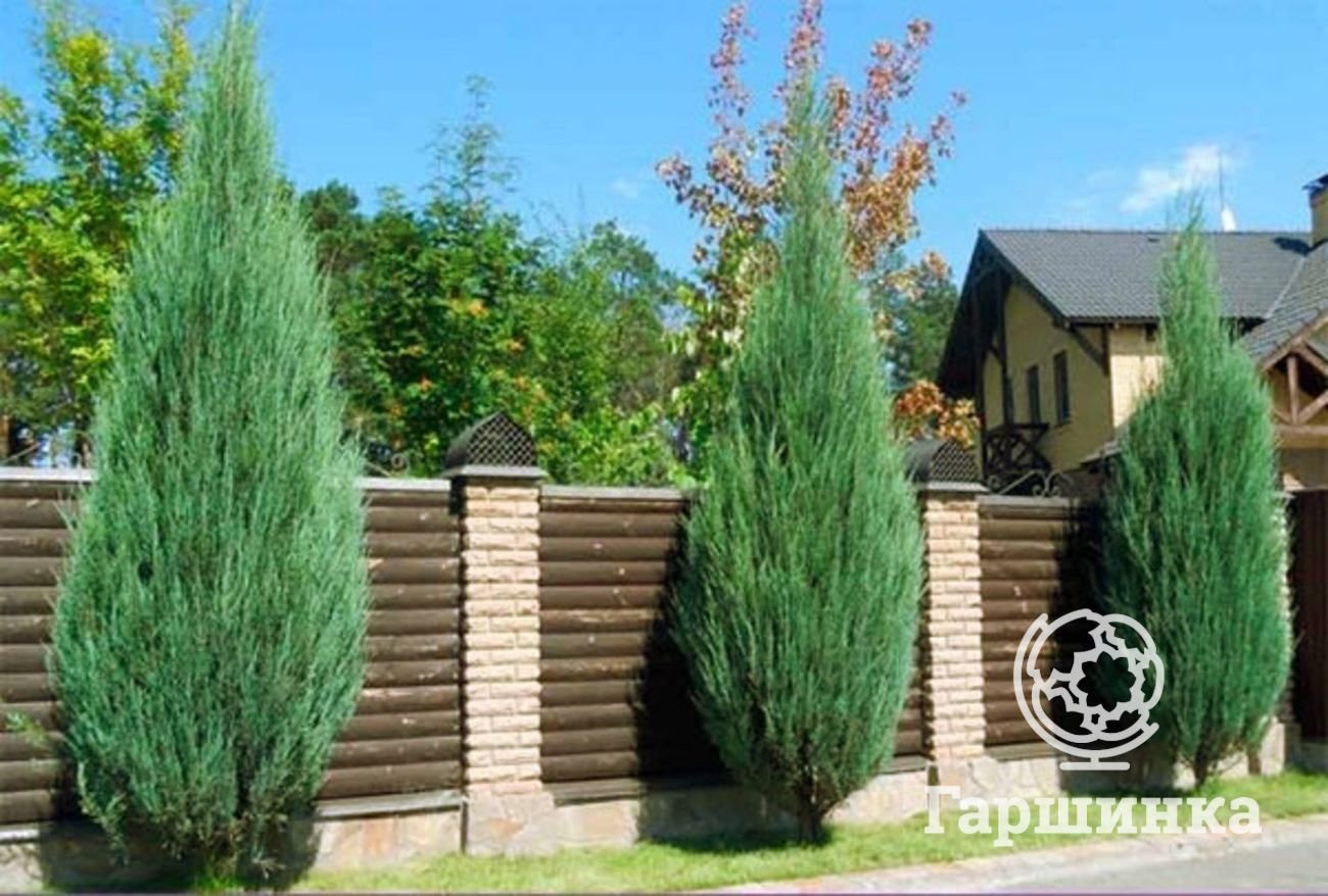 Можжевельник Блю Эрроу вдоль забора