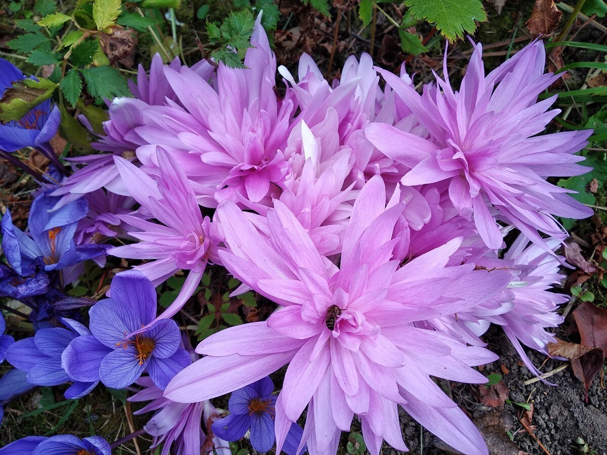 Безвременник на клумбе с другими цветами