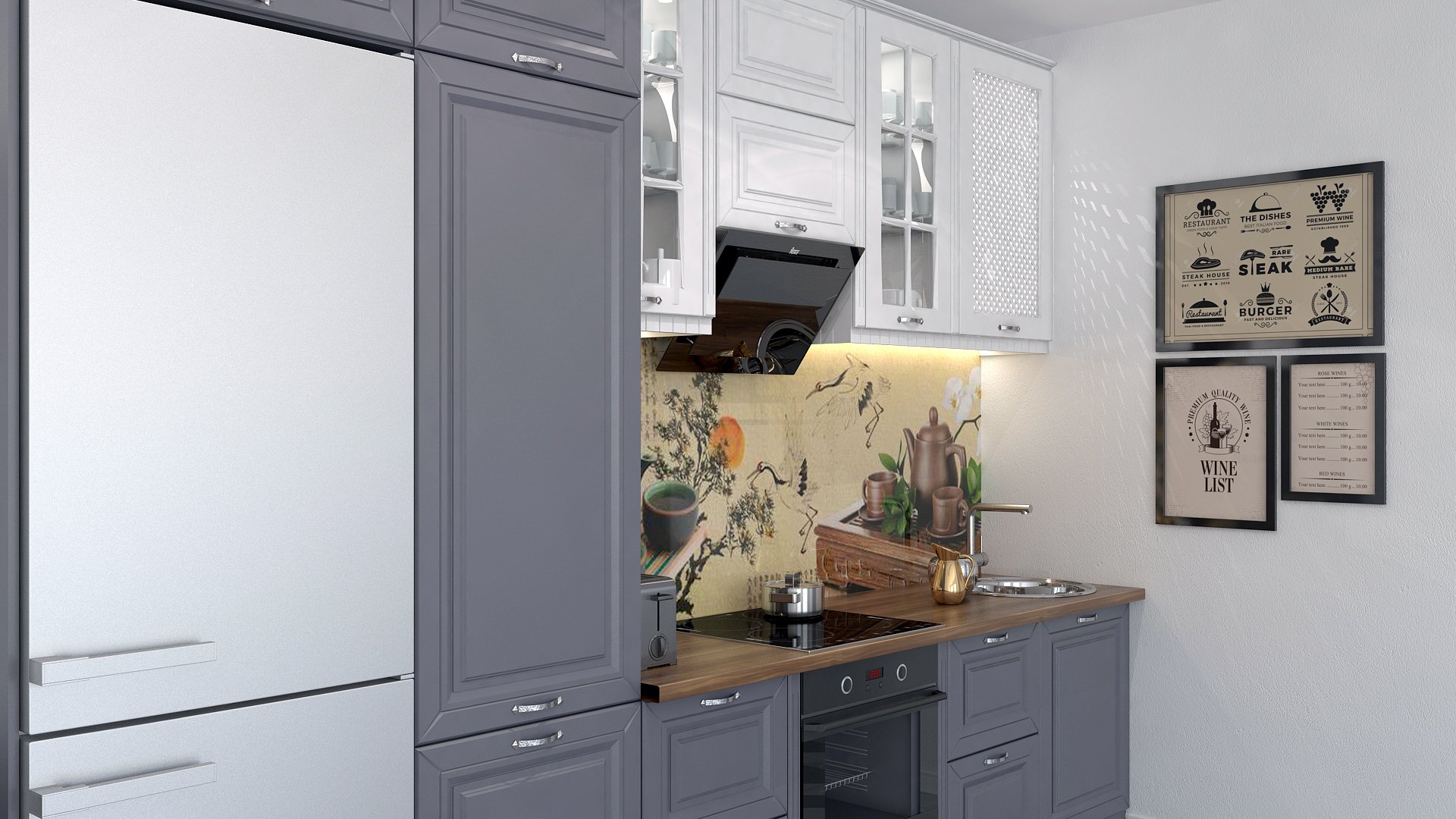 Белая кухня с серым холодильником