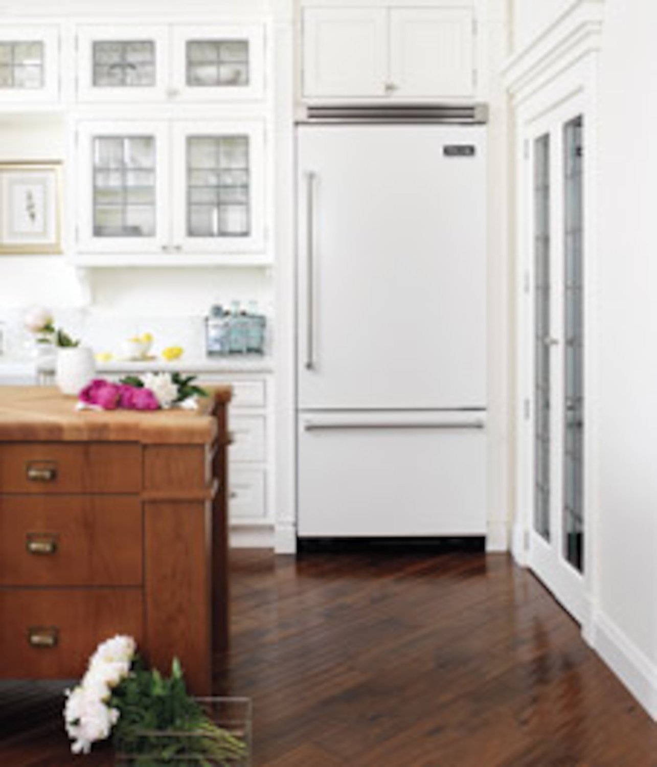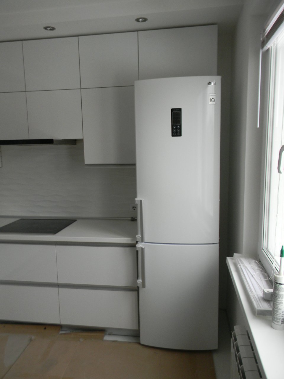 Белый холодильник на белой кухне
