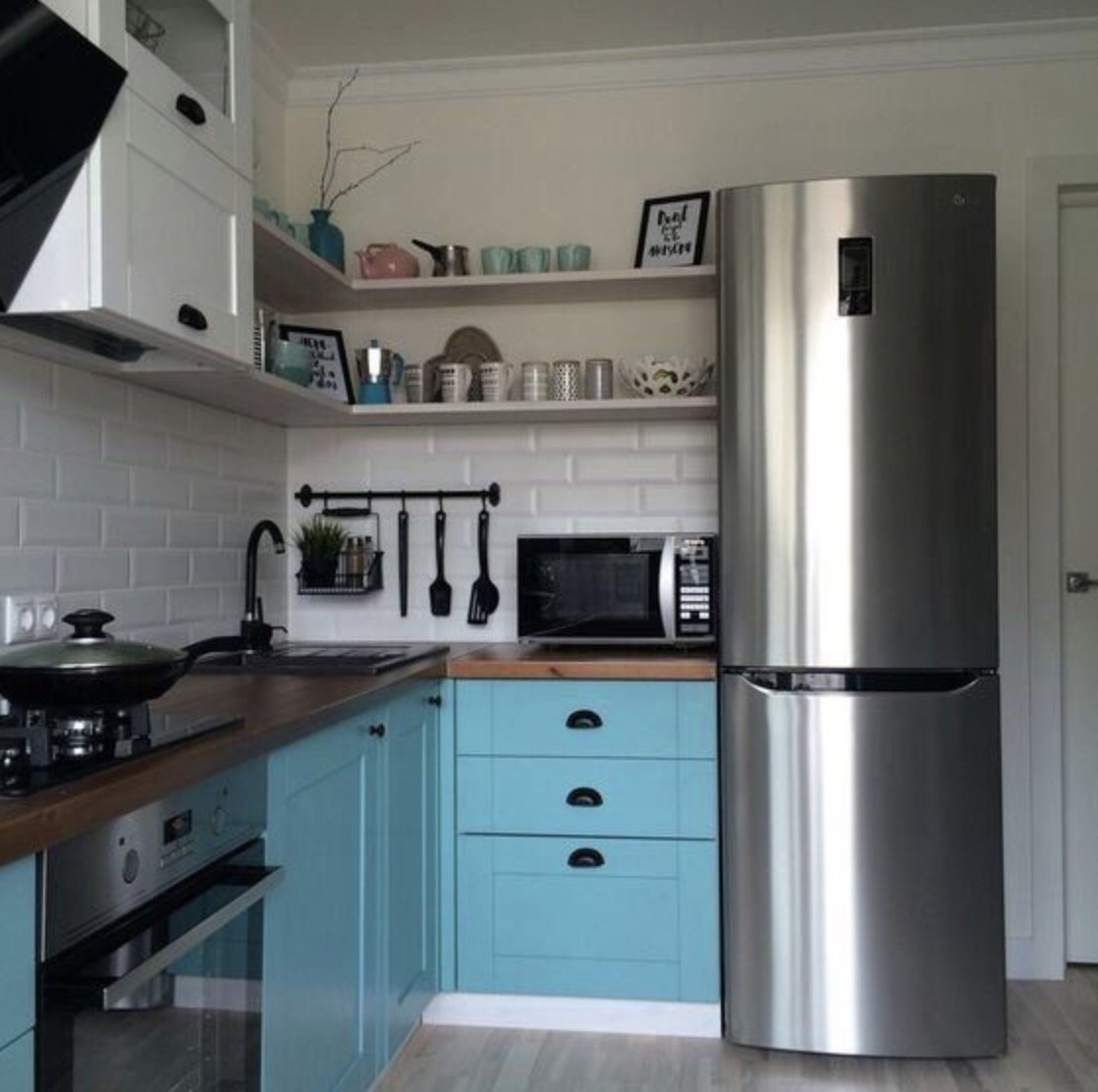 Маленькая угловая кухня с холодильником