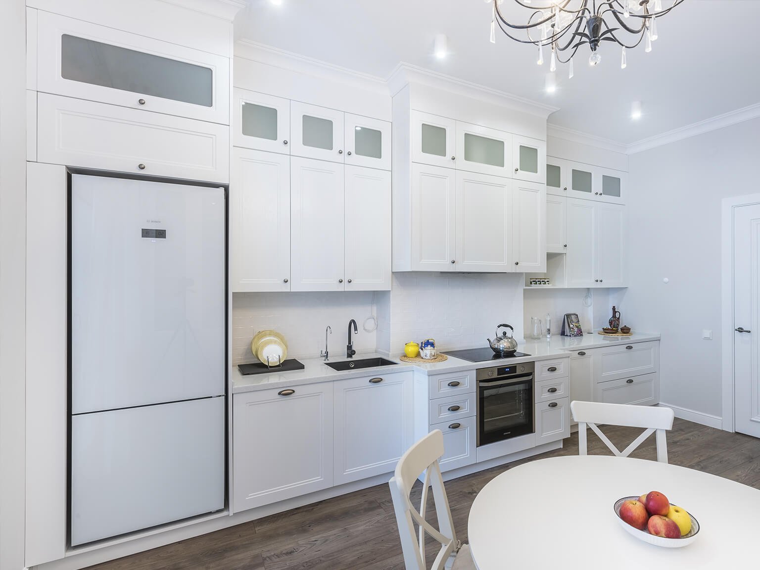 Белая кухня с черной техникой
