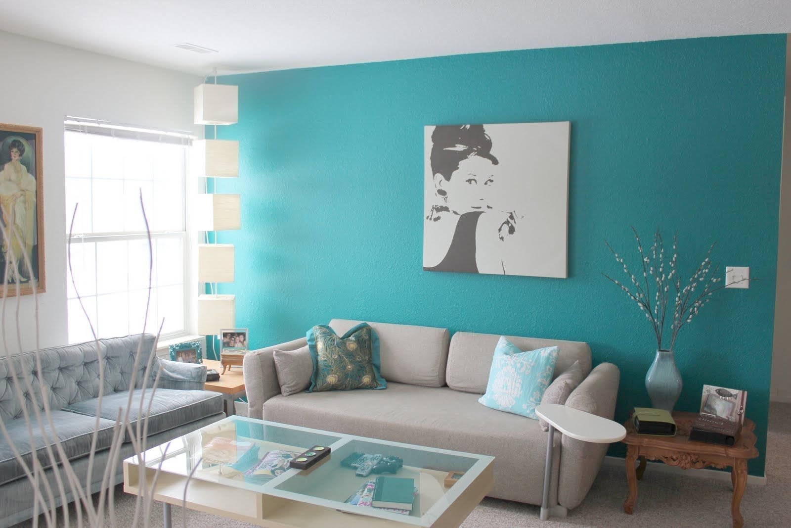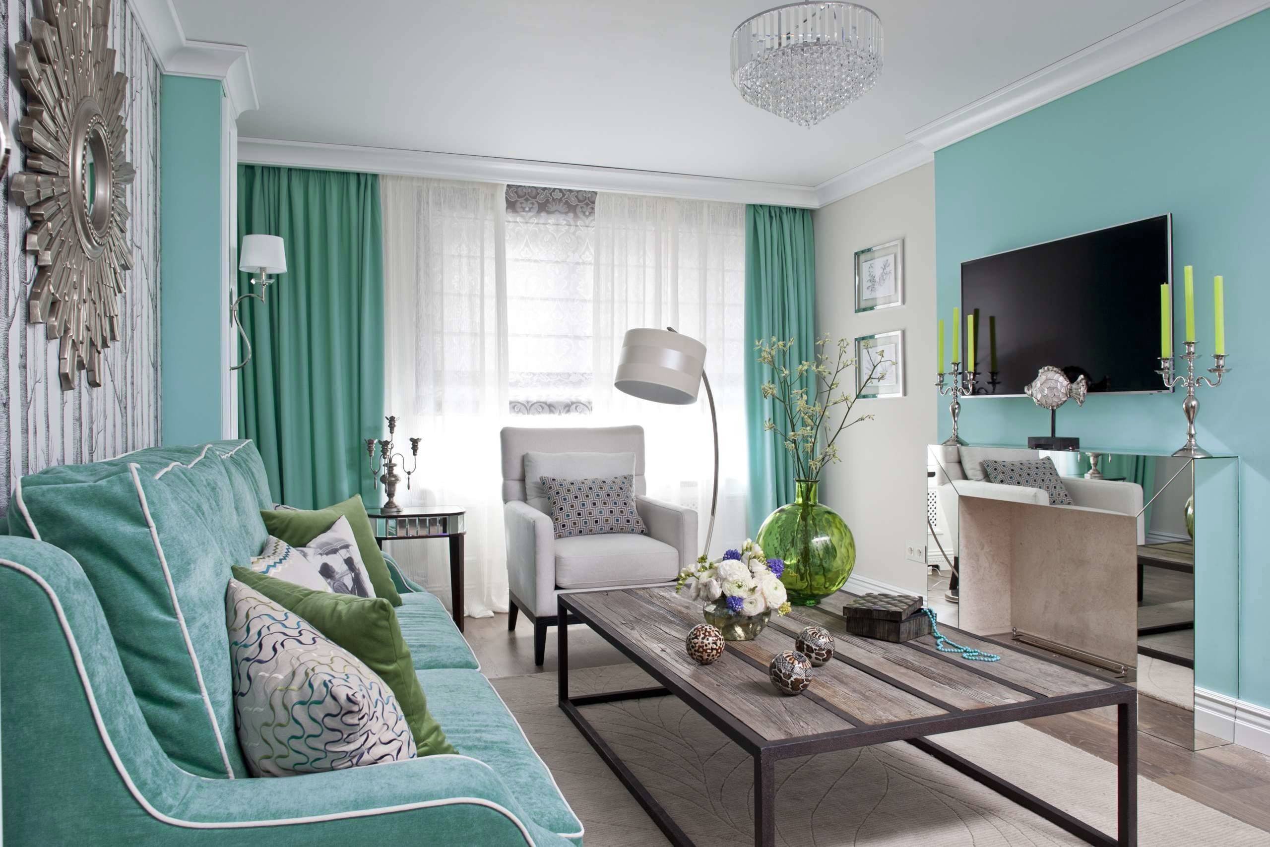 Бирюзовый оттенок стен в интерьере гостиной
