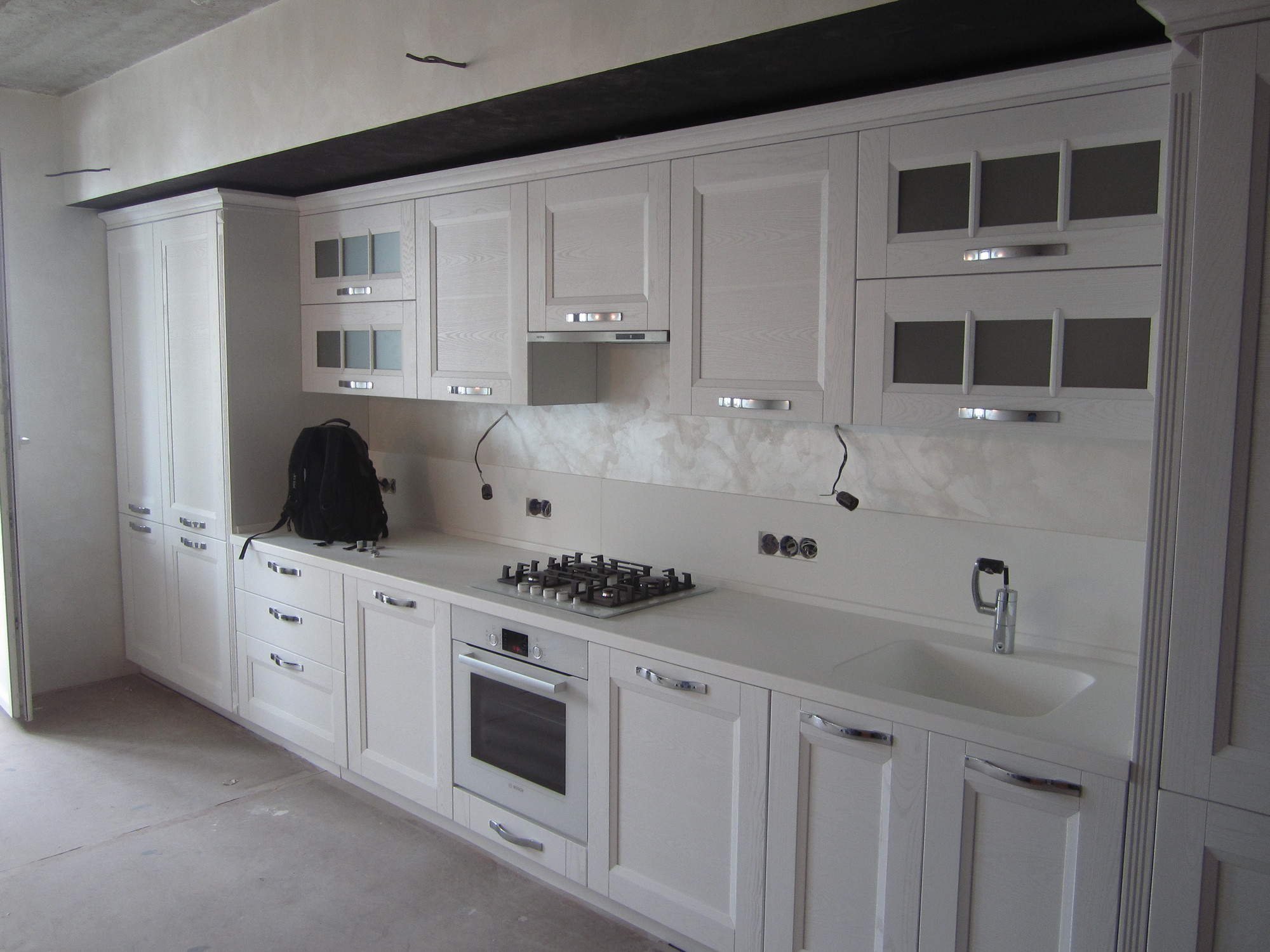Короб из гипсокартона над кухонным гарнитуром вровень со шкафами