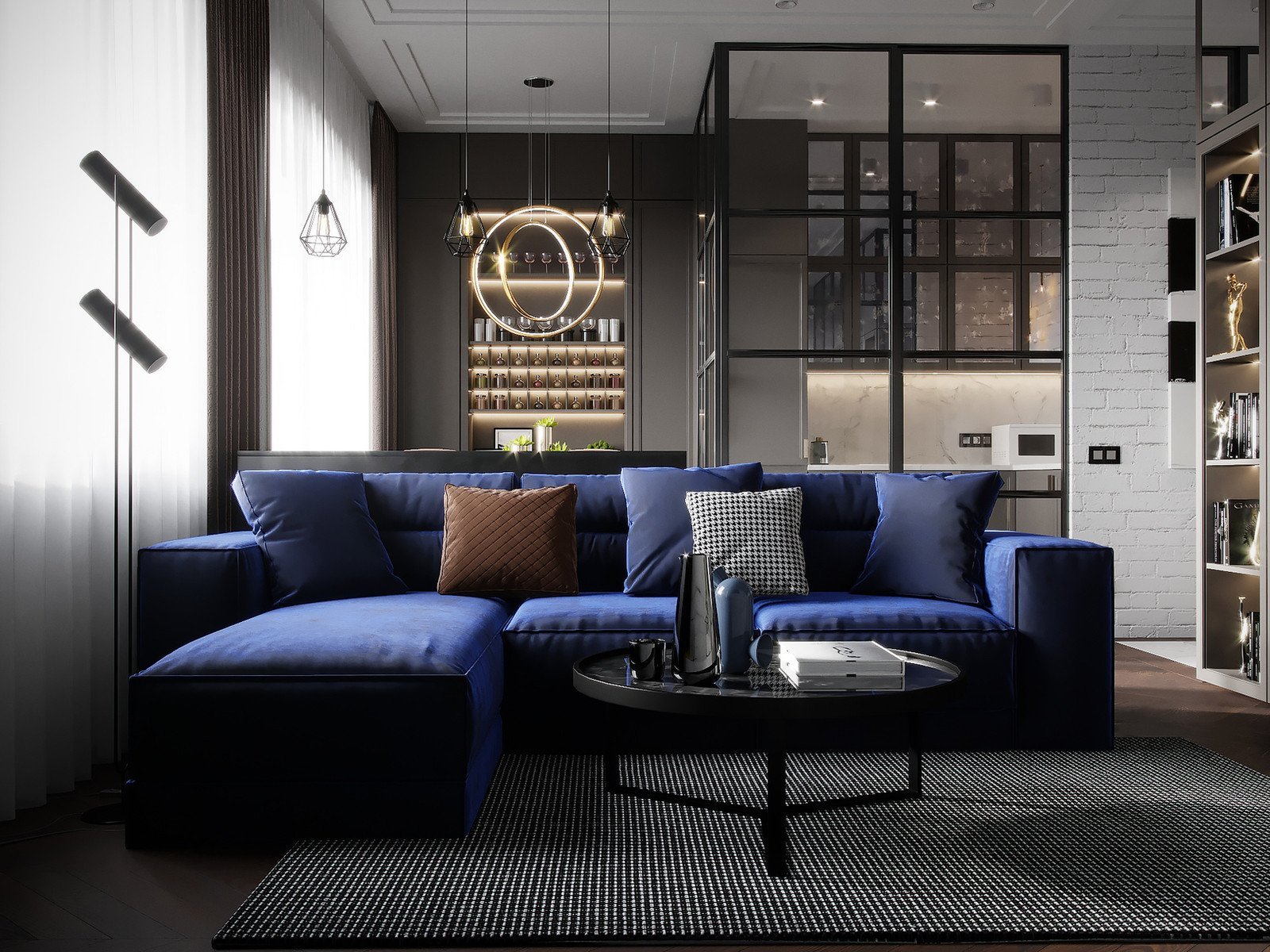 Синий диван в бежевом интерьере