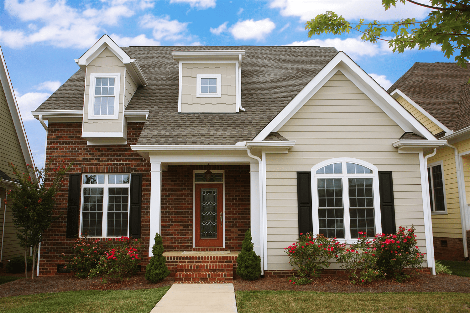 Бежевый дом с белыми окнами