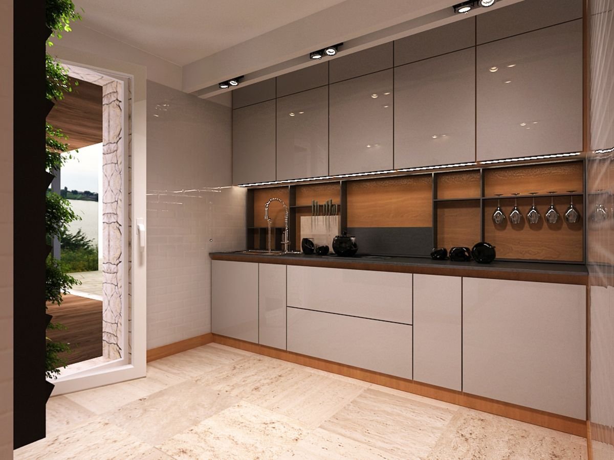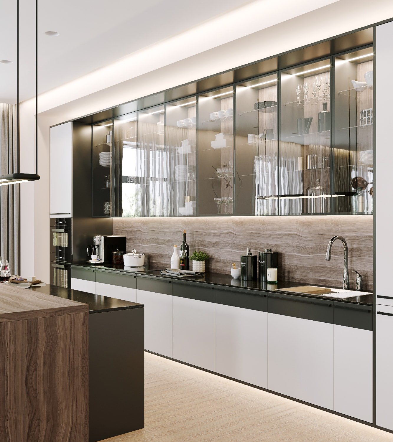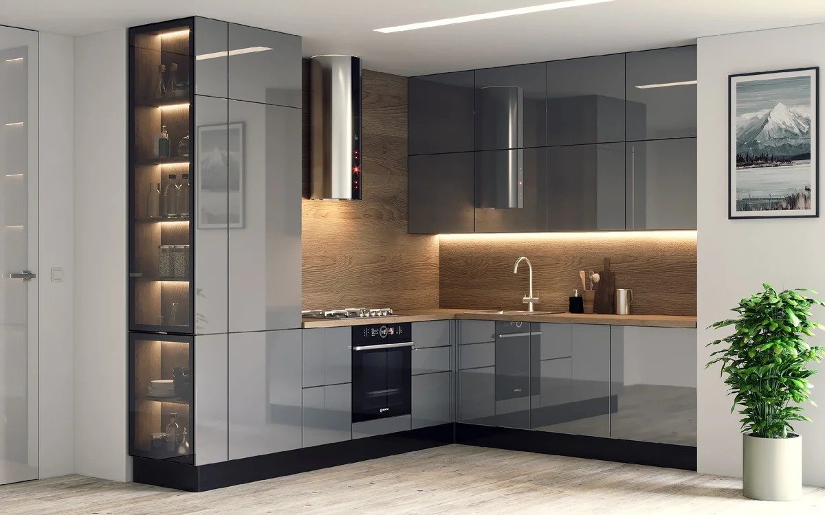 Современная кухня с стеклянным пеналом