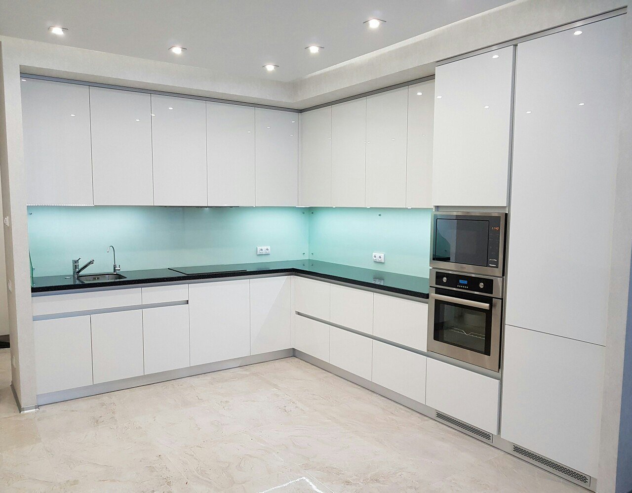 Белая кухня со стеклянными фасадами угловая