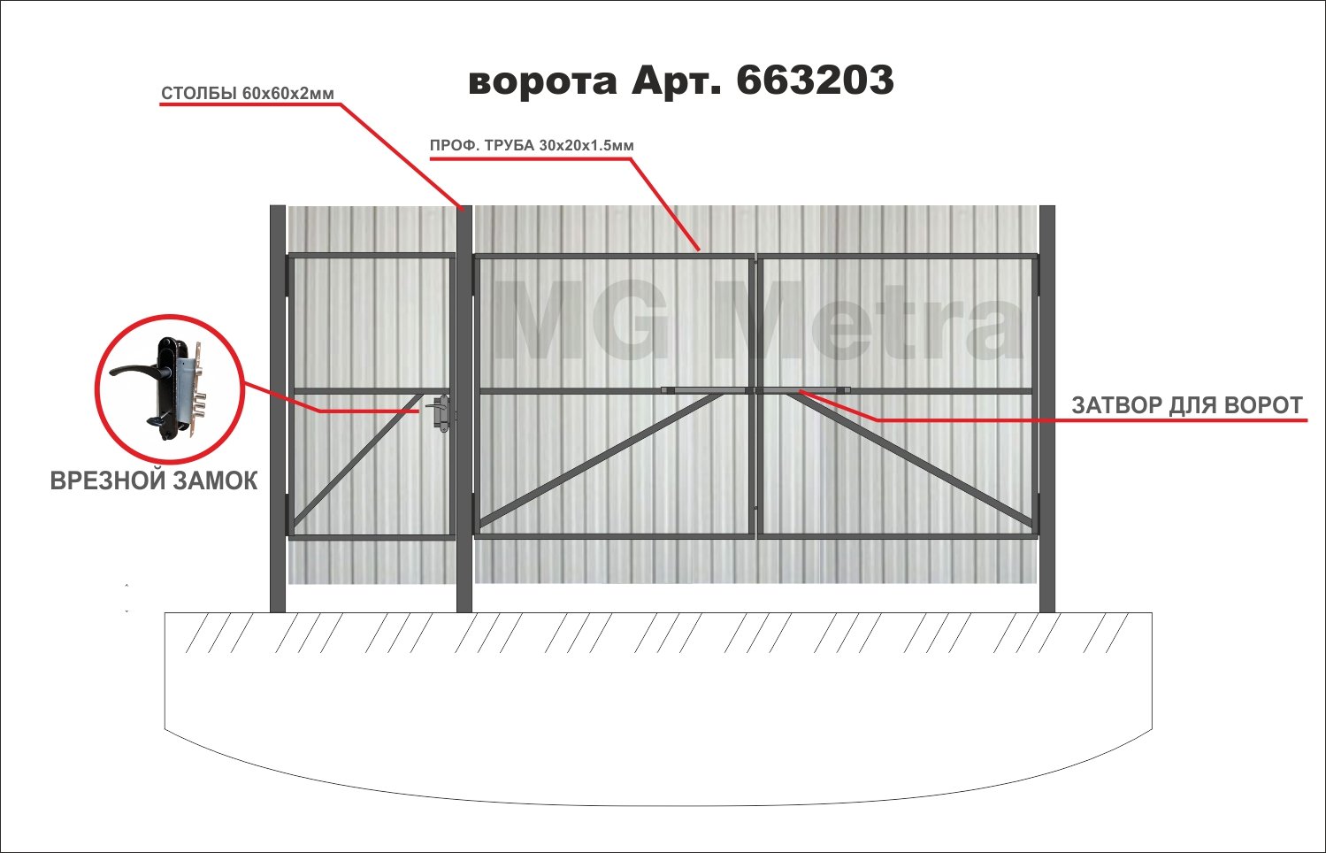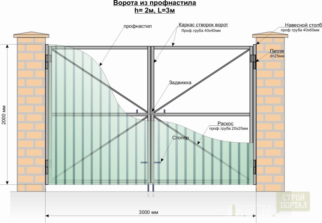 Ворота распашные 4 метра из профильной трубы и профлиста чертеж
