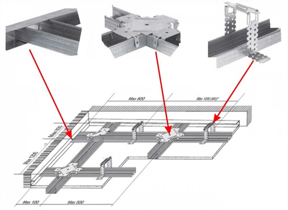 Каркас под ГКЛ на потолок схема монтажа