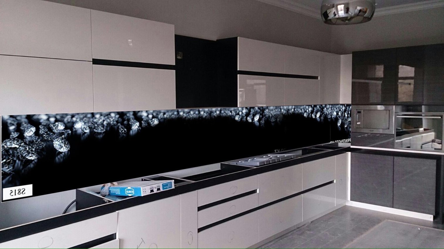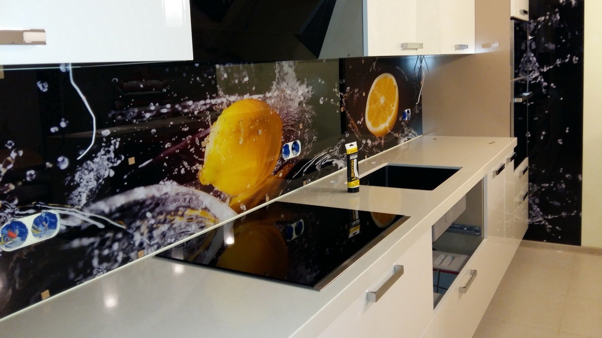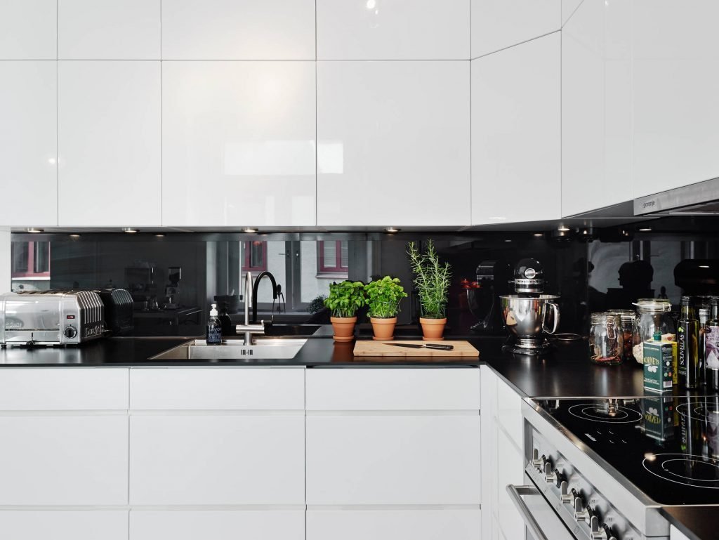 Белая глянцевая кухня с черным фартуком