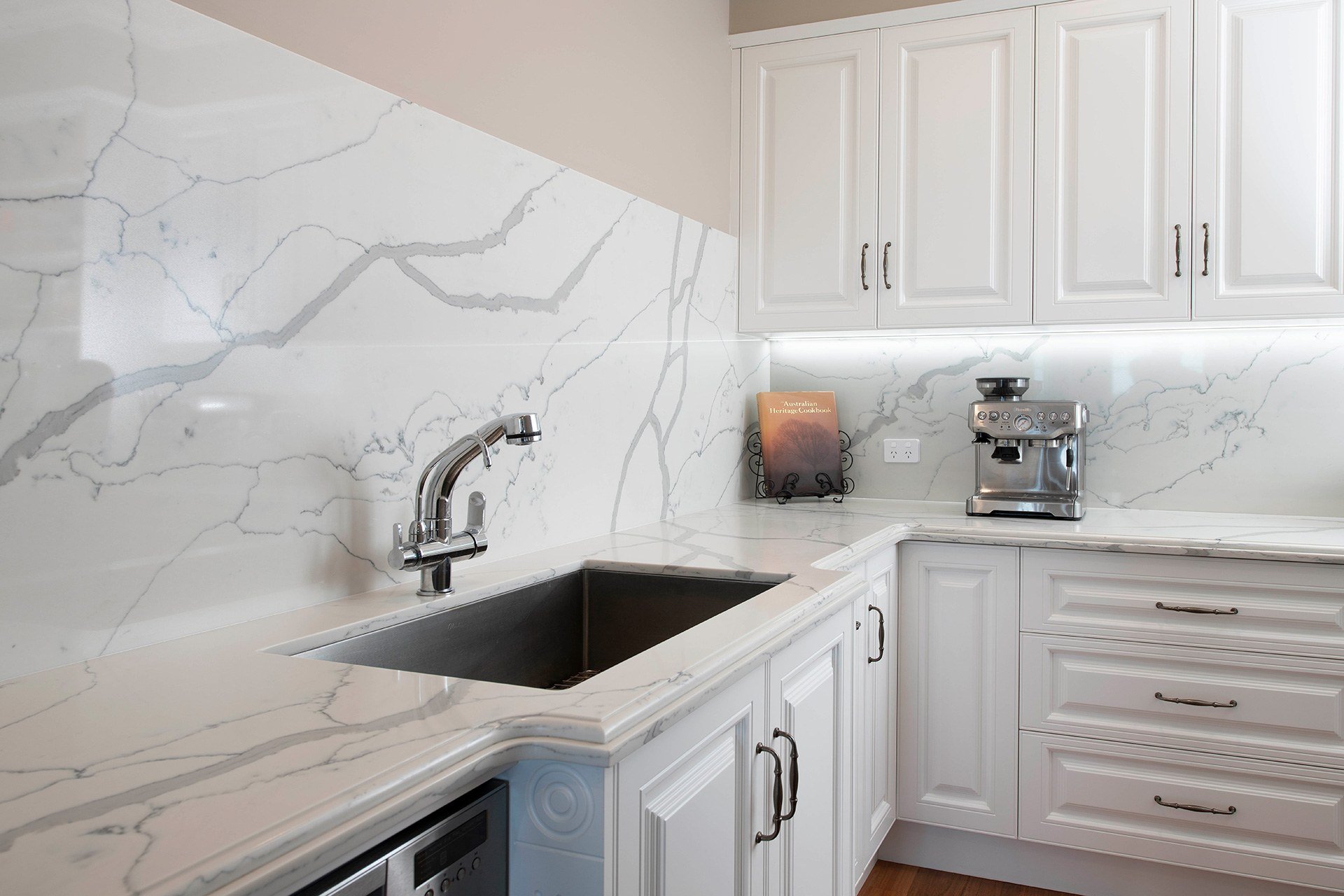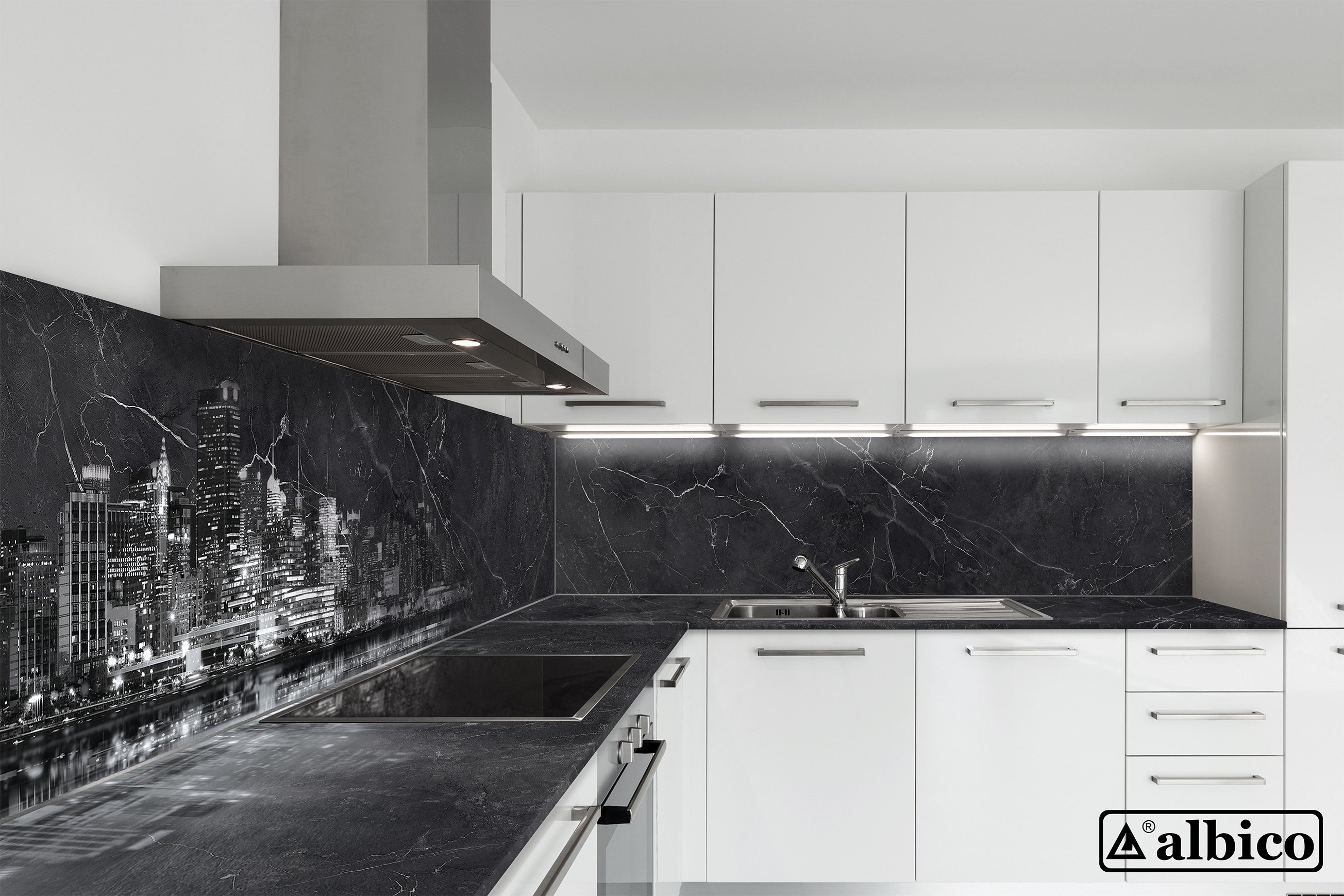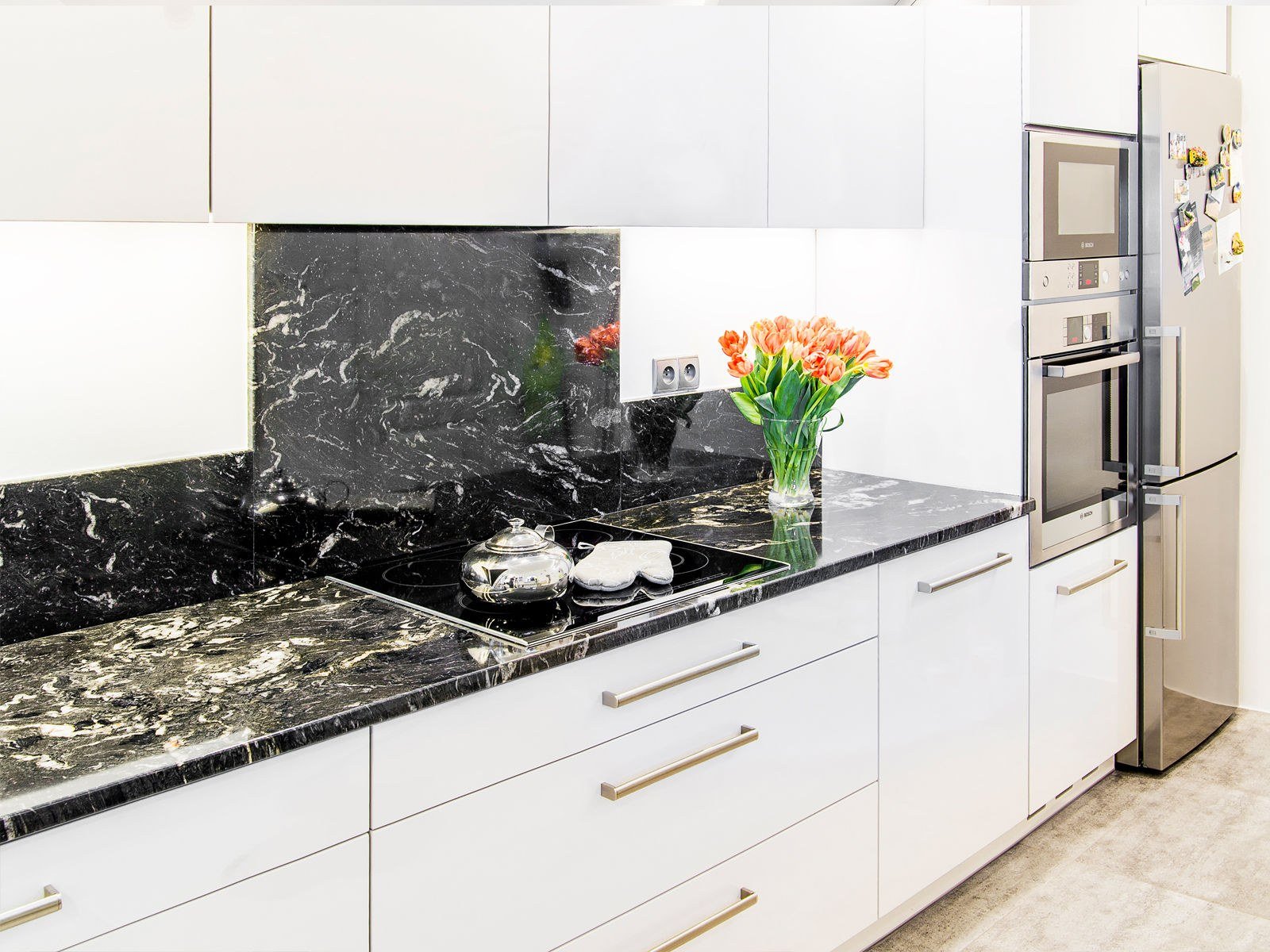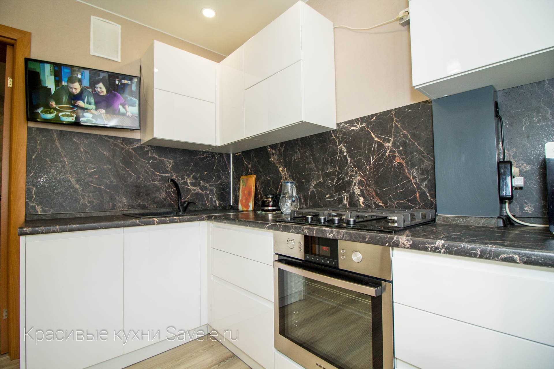 Белая кухня с чёрной столешницей и белым фартуком