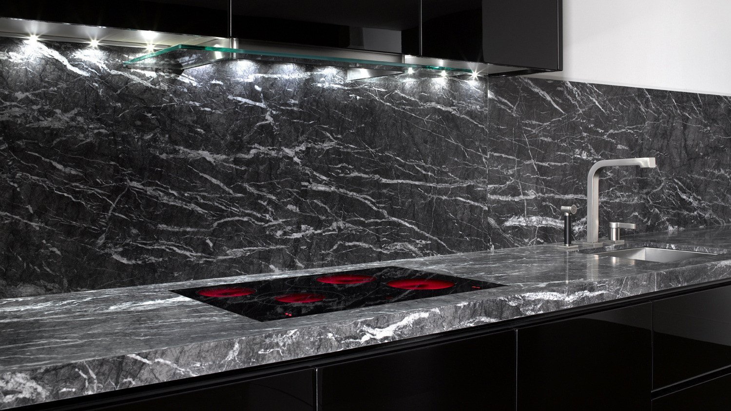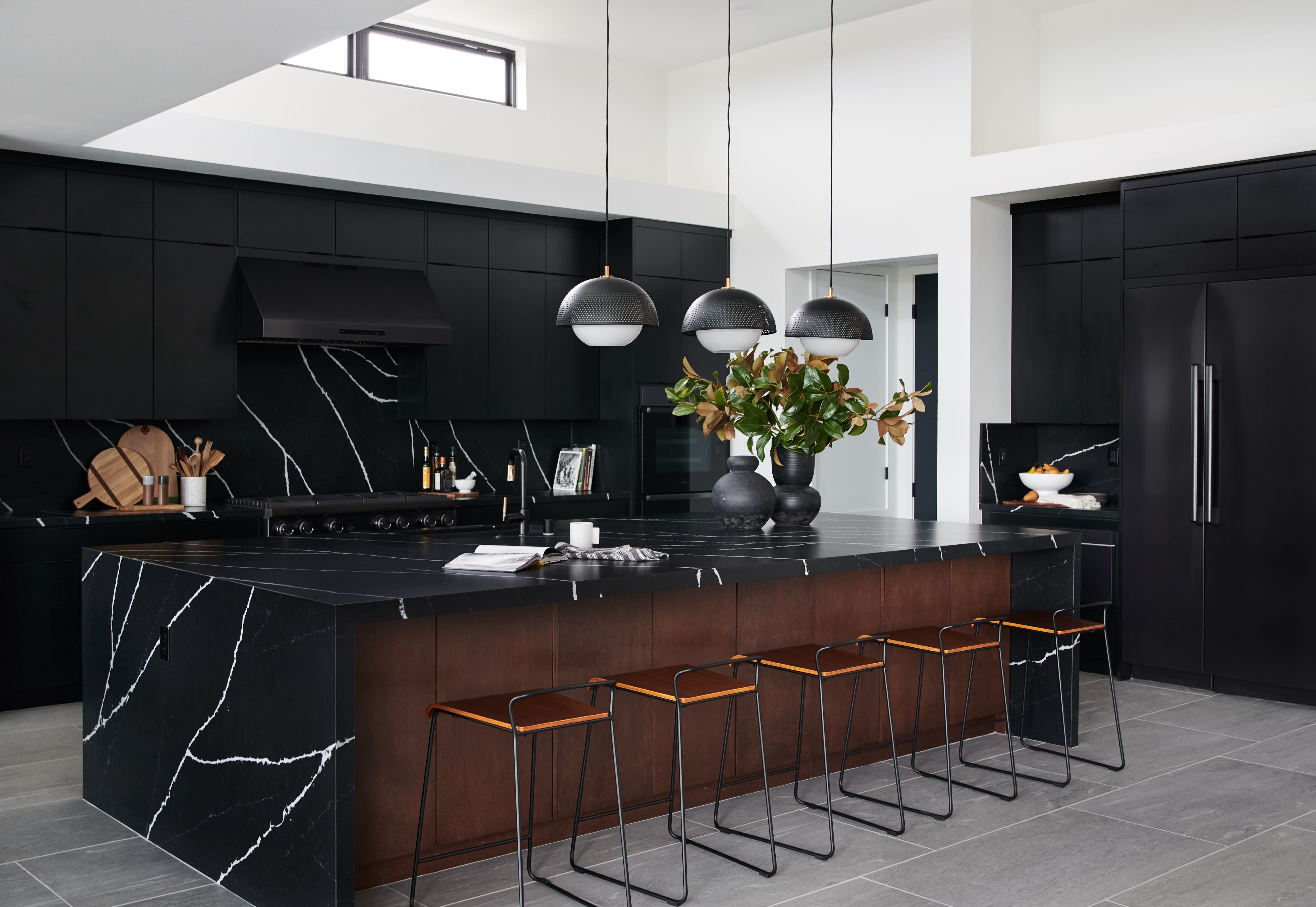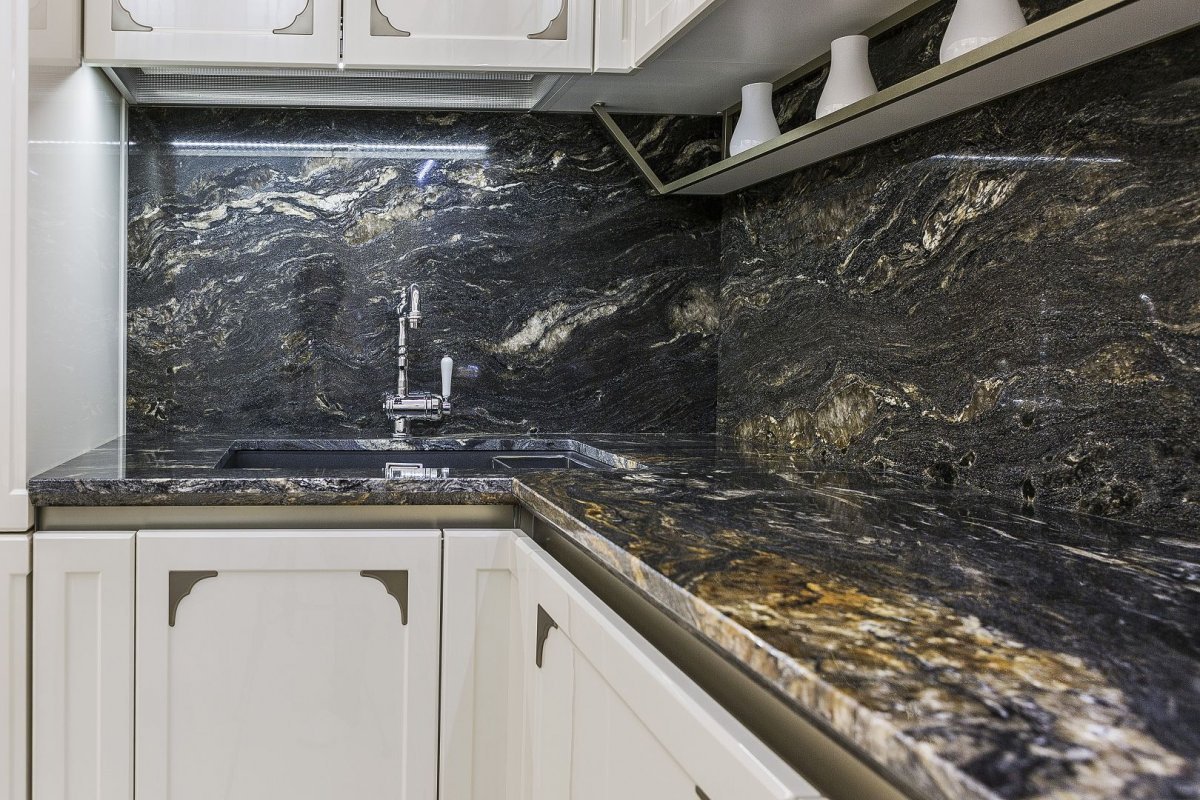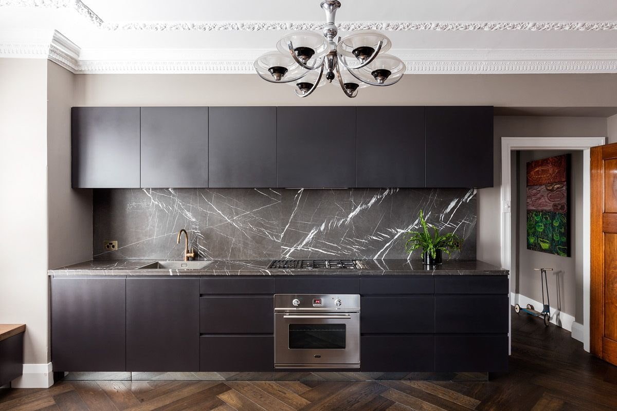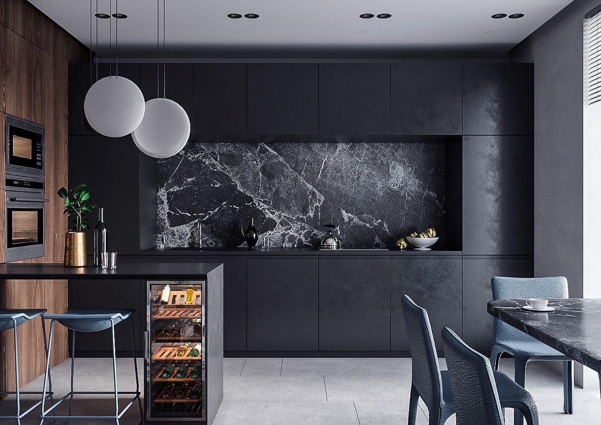 Черная мраморная кухня в интерьере