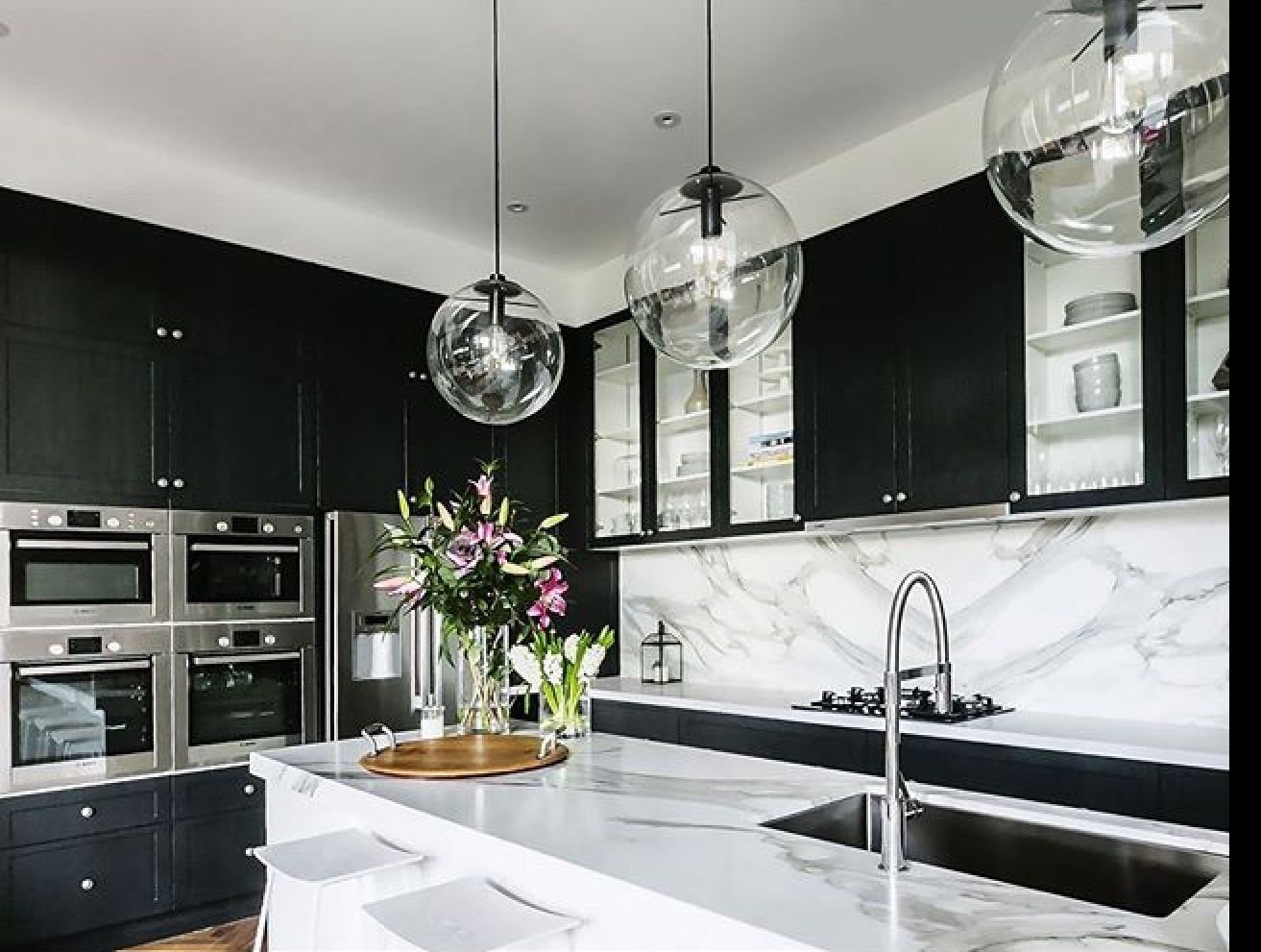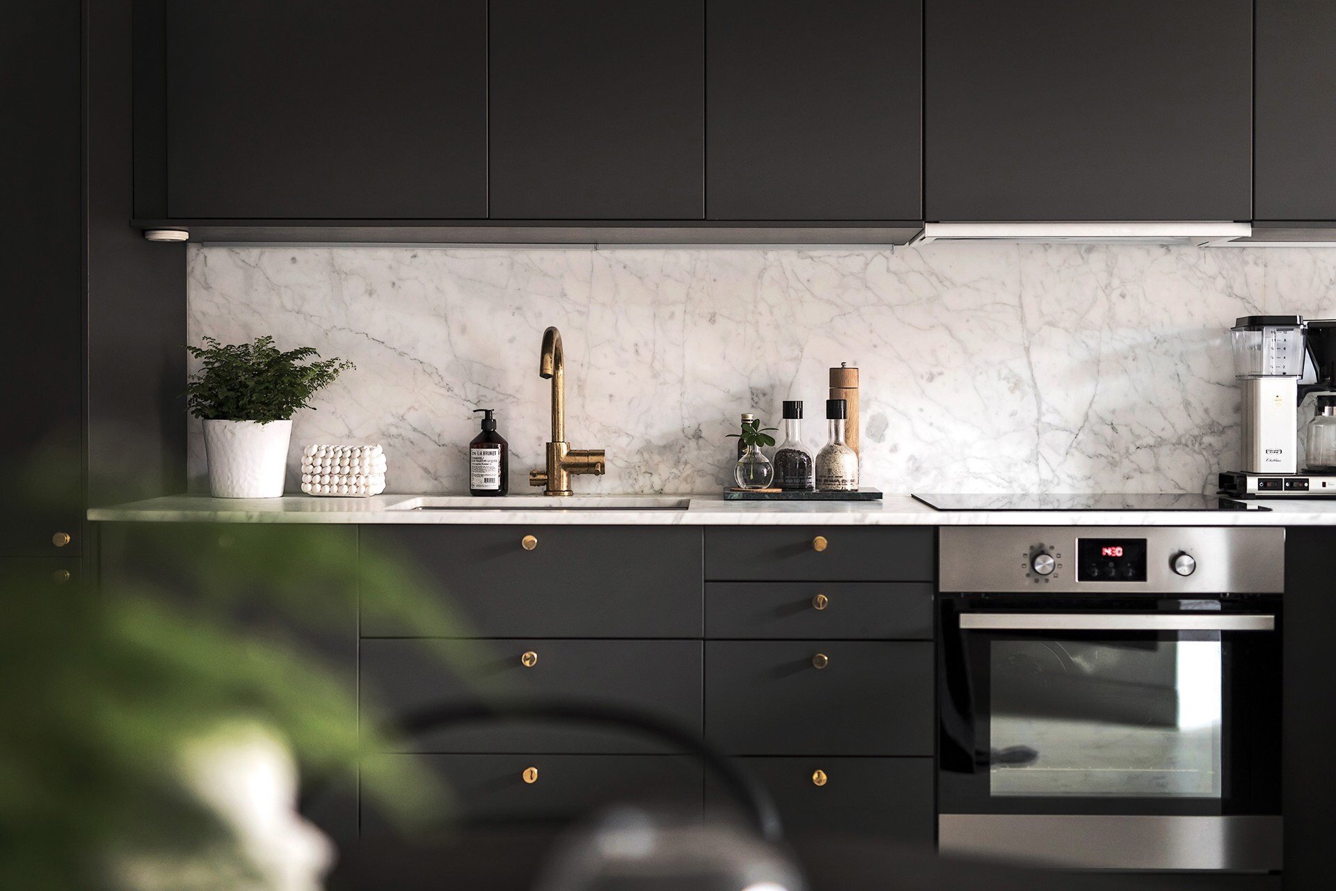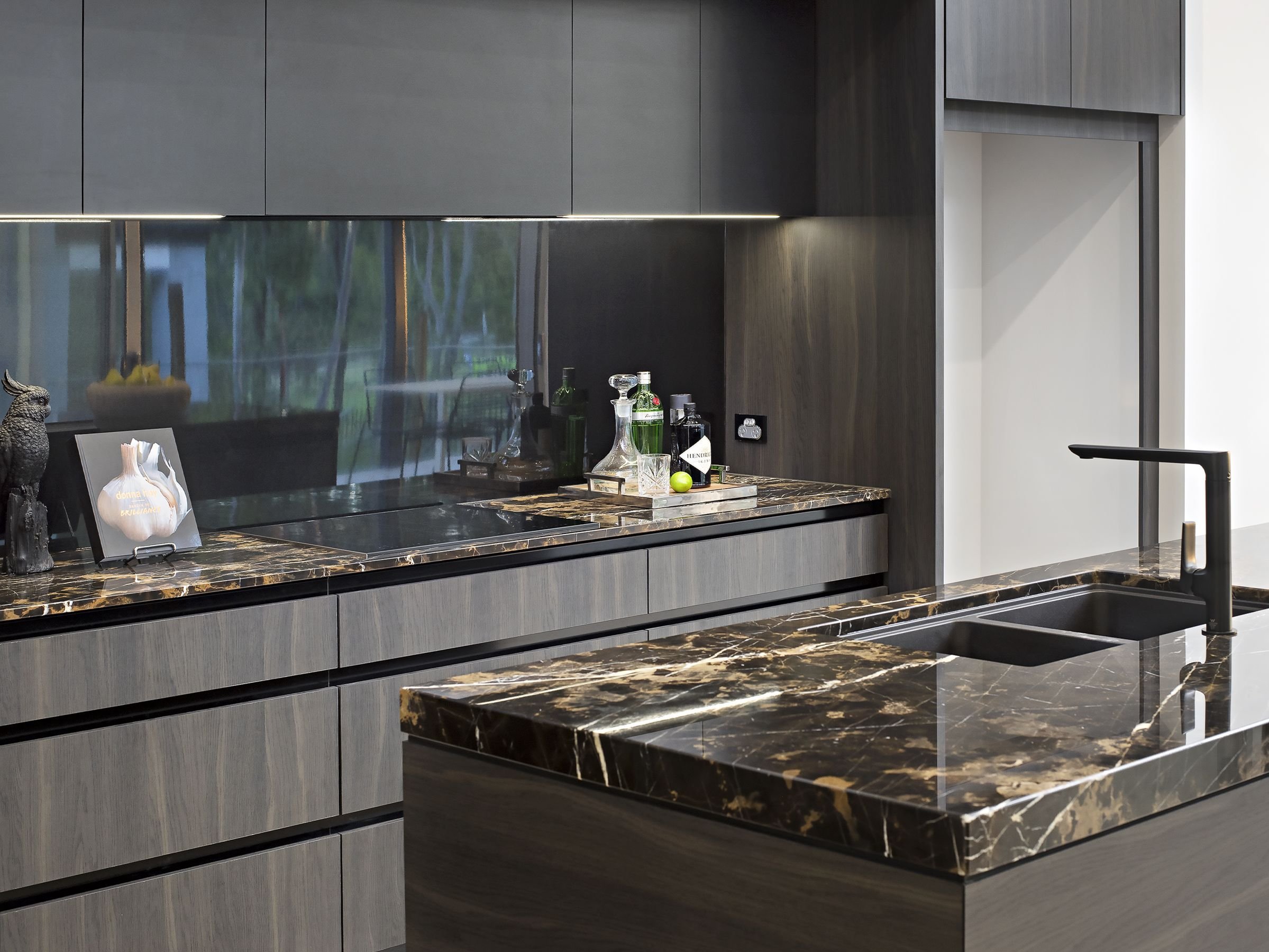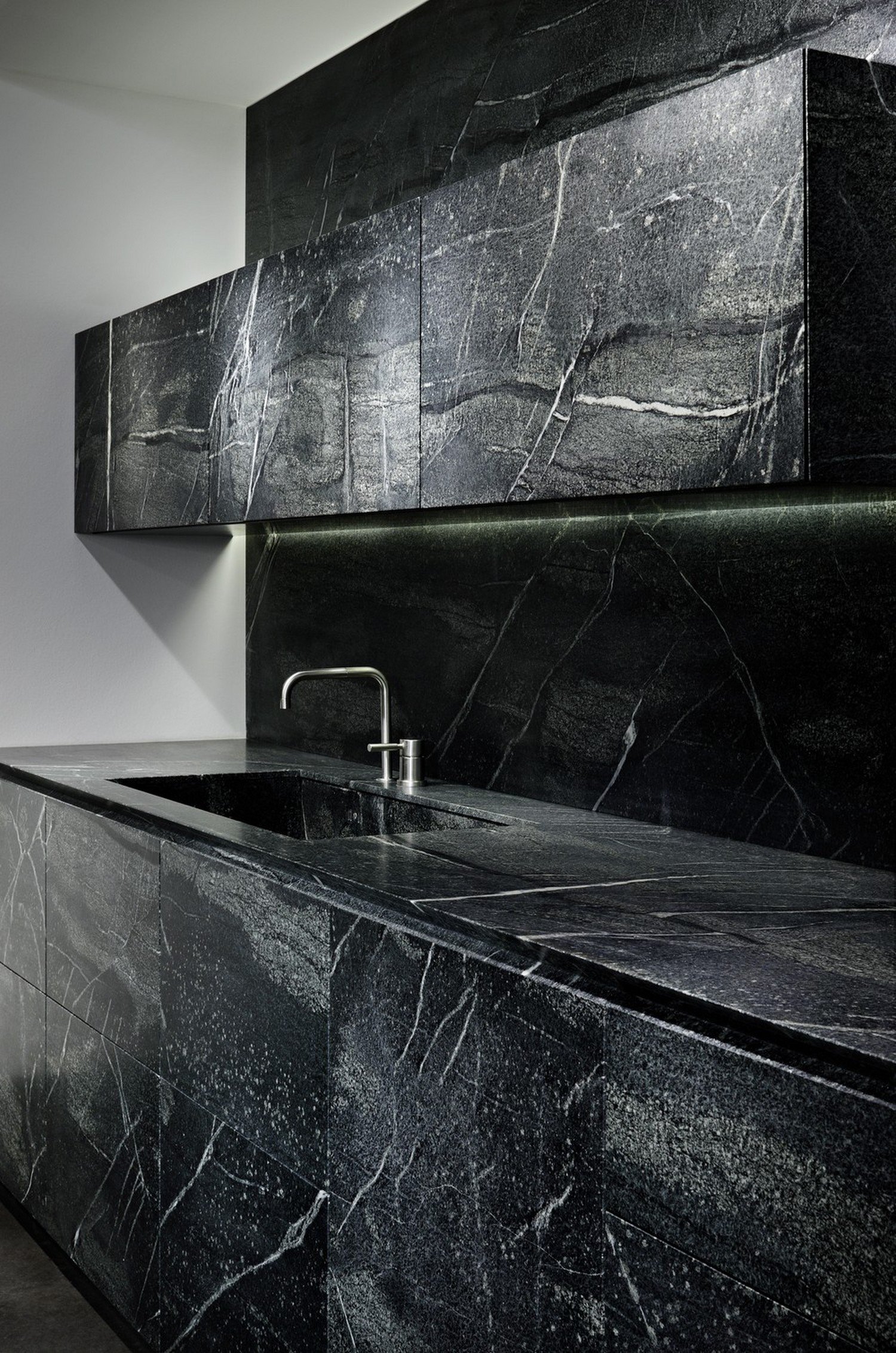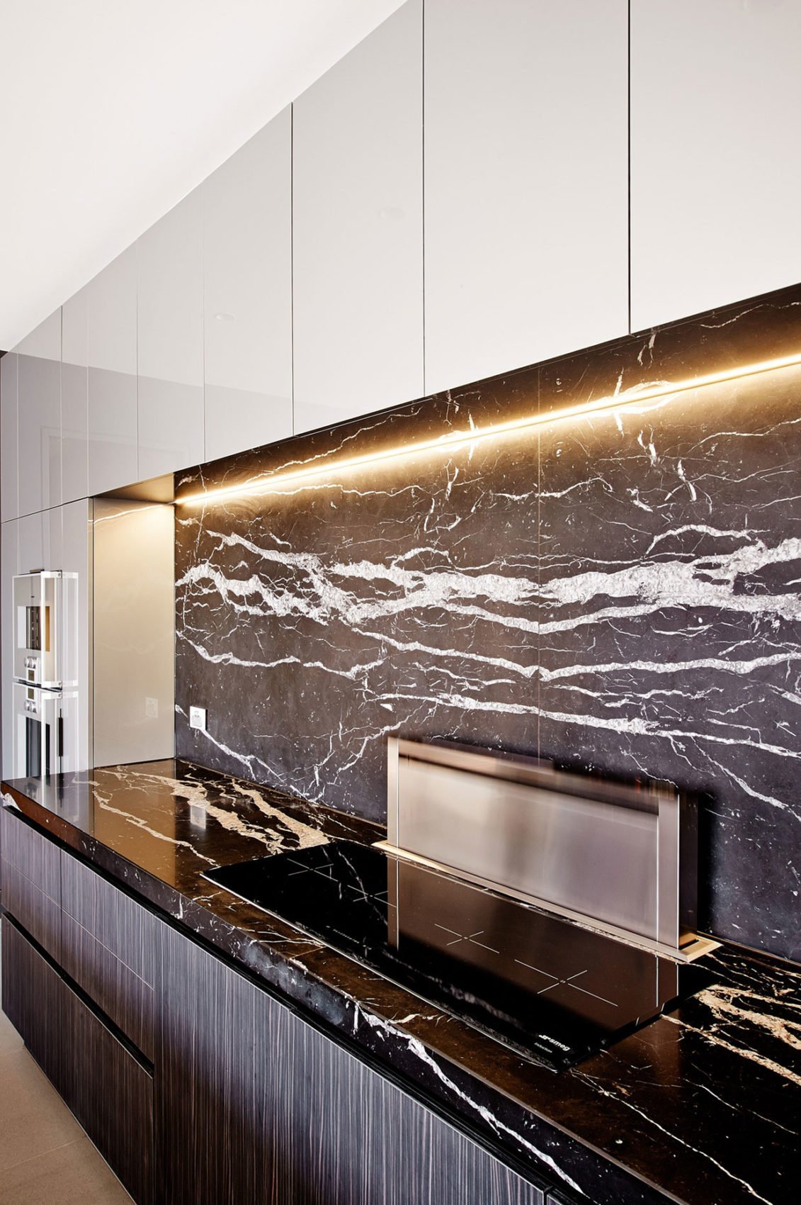 Черная мраморная кухня в интерьере