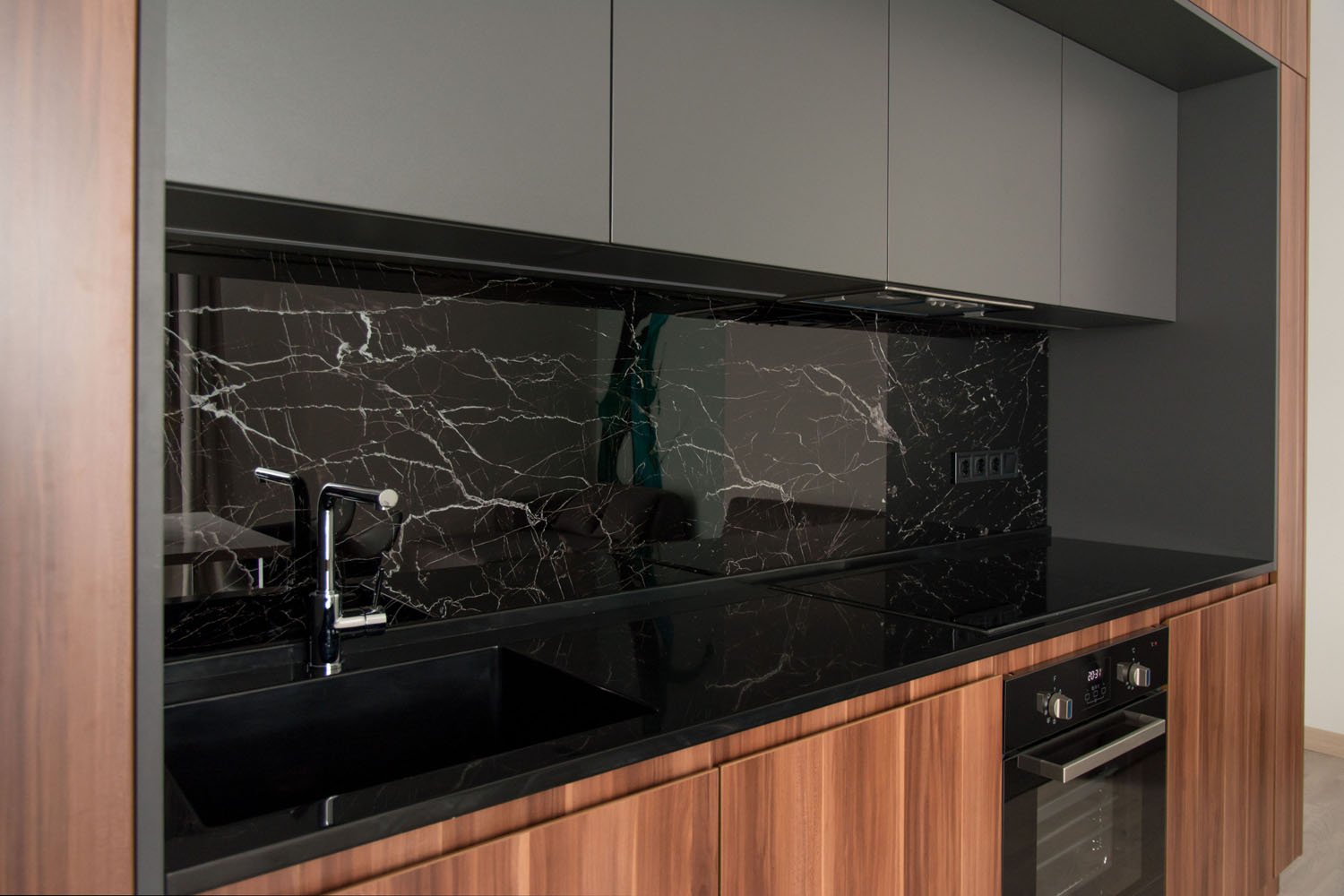 Серая кухня с черным фартуком