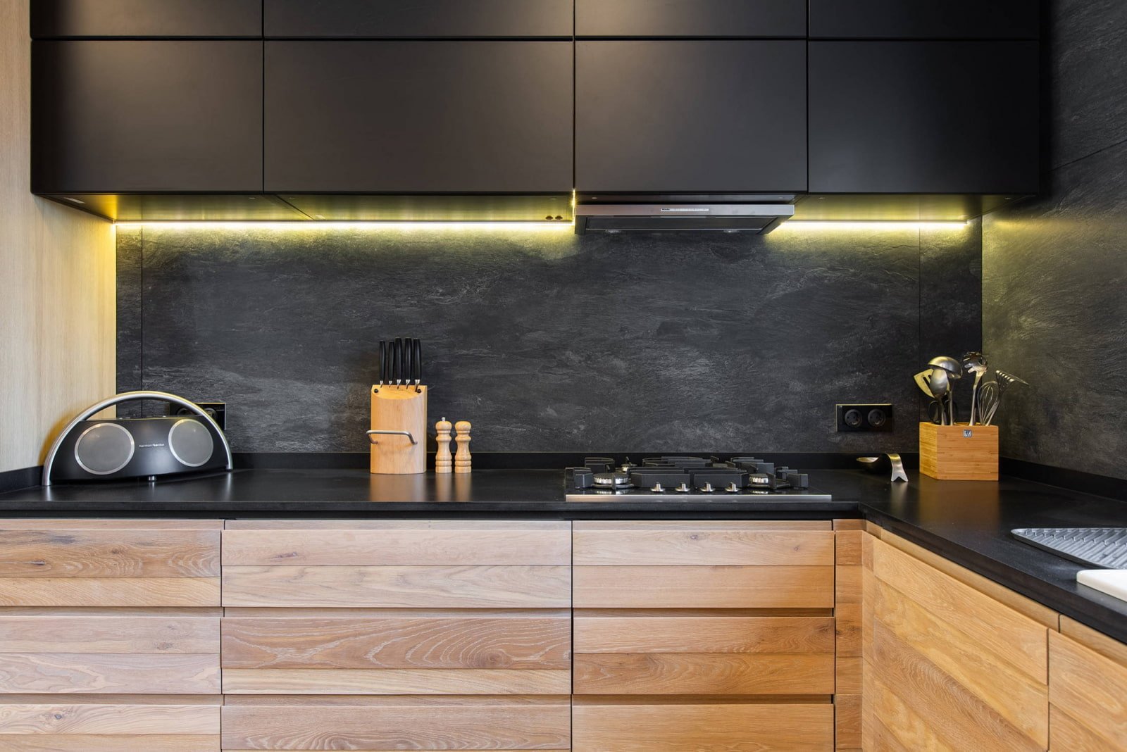 Кухня с черной столешницей и фартуком