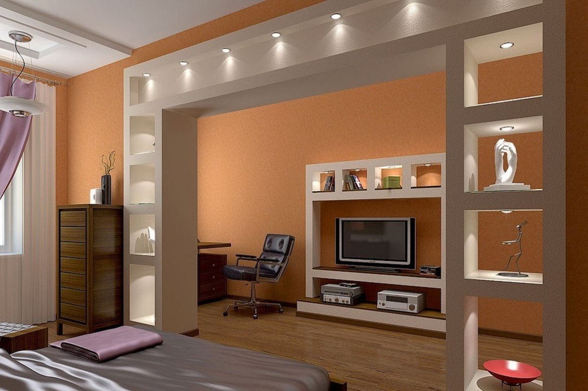 Гипсокартонные конструкции в гостиной под телевизор