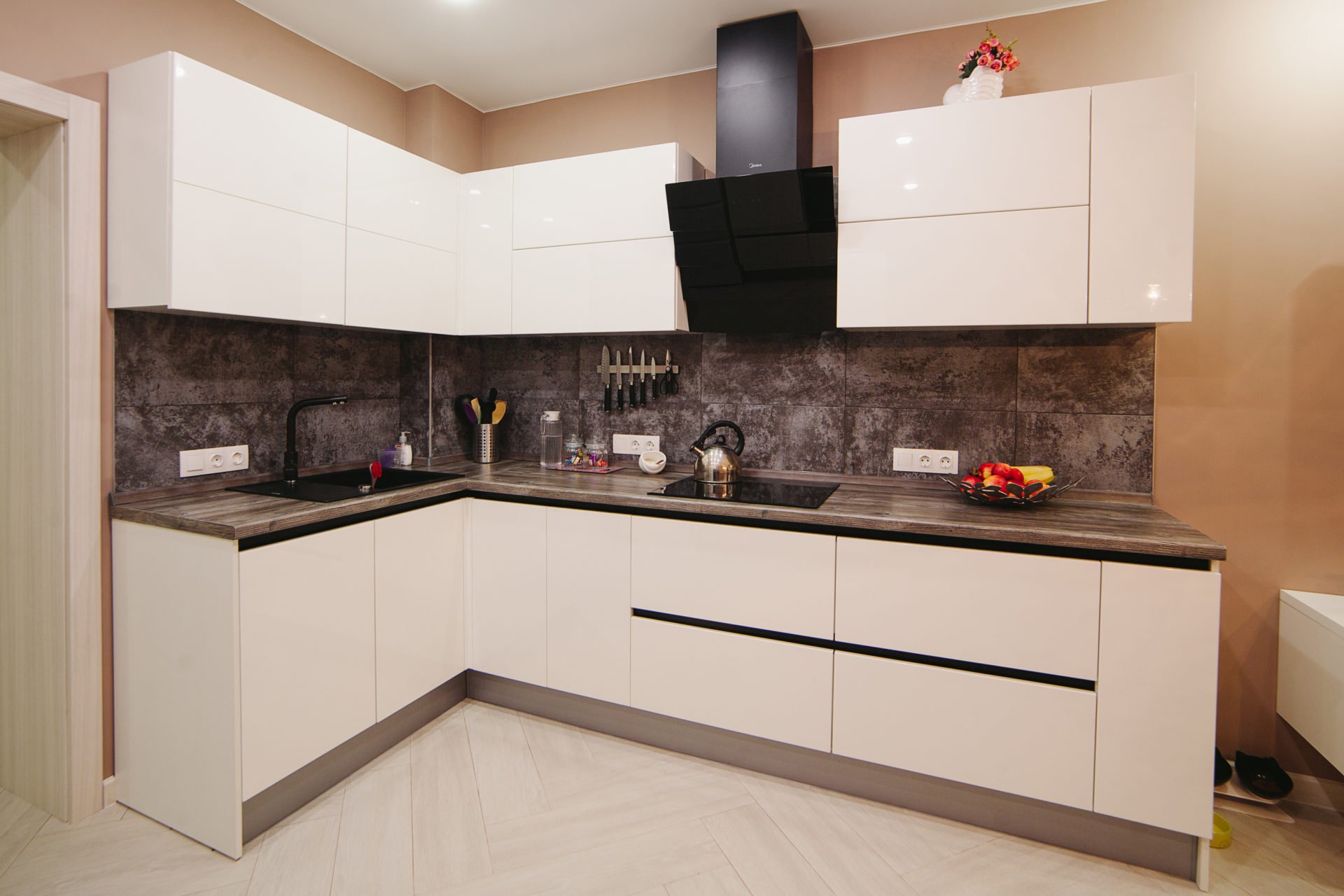 Бежевая кухня с черным фартуком