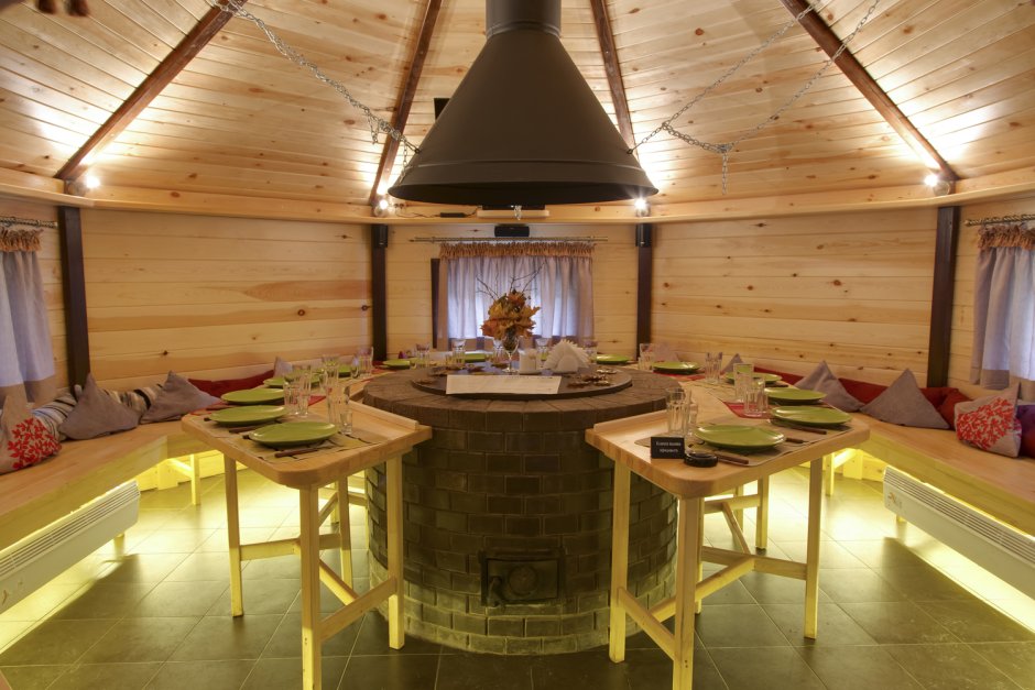 Баня с террасой и мангальной зоной и бассейном под крышей