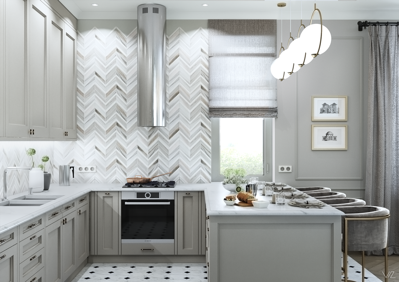 Серая кухня с мраморным полом