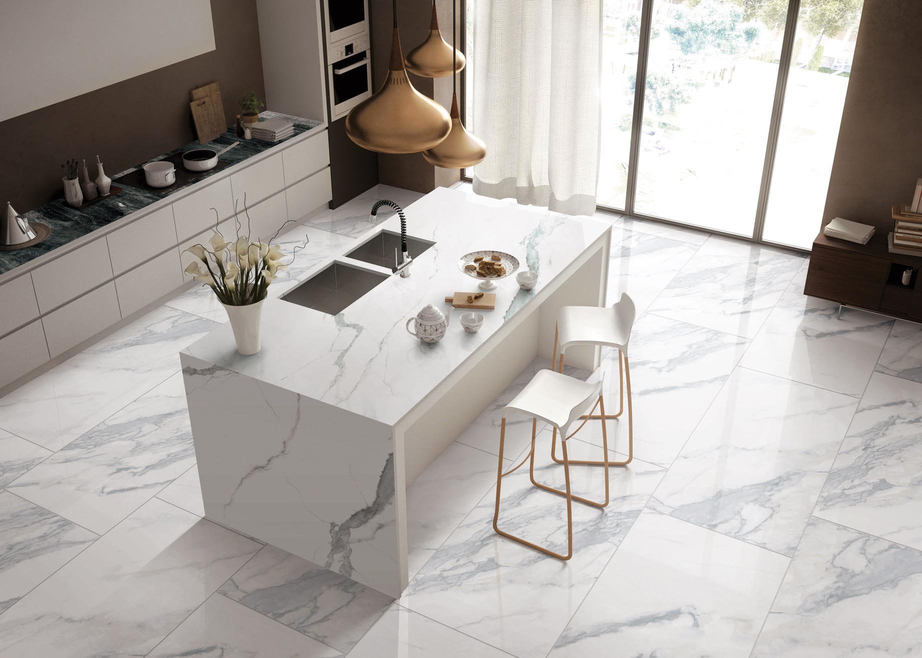 Кухня с мраморной плиткой на полу