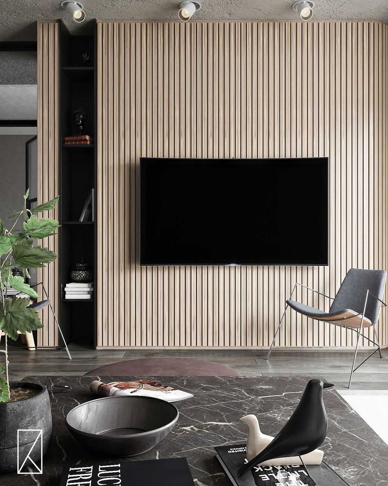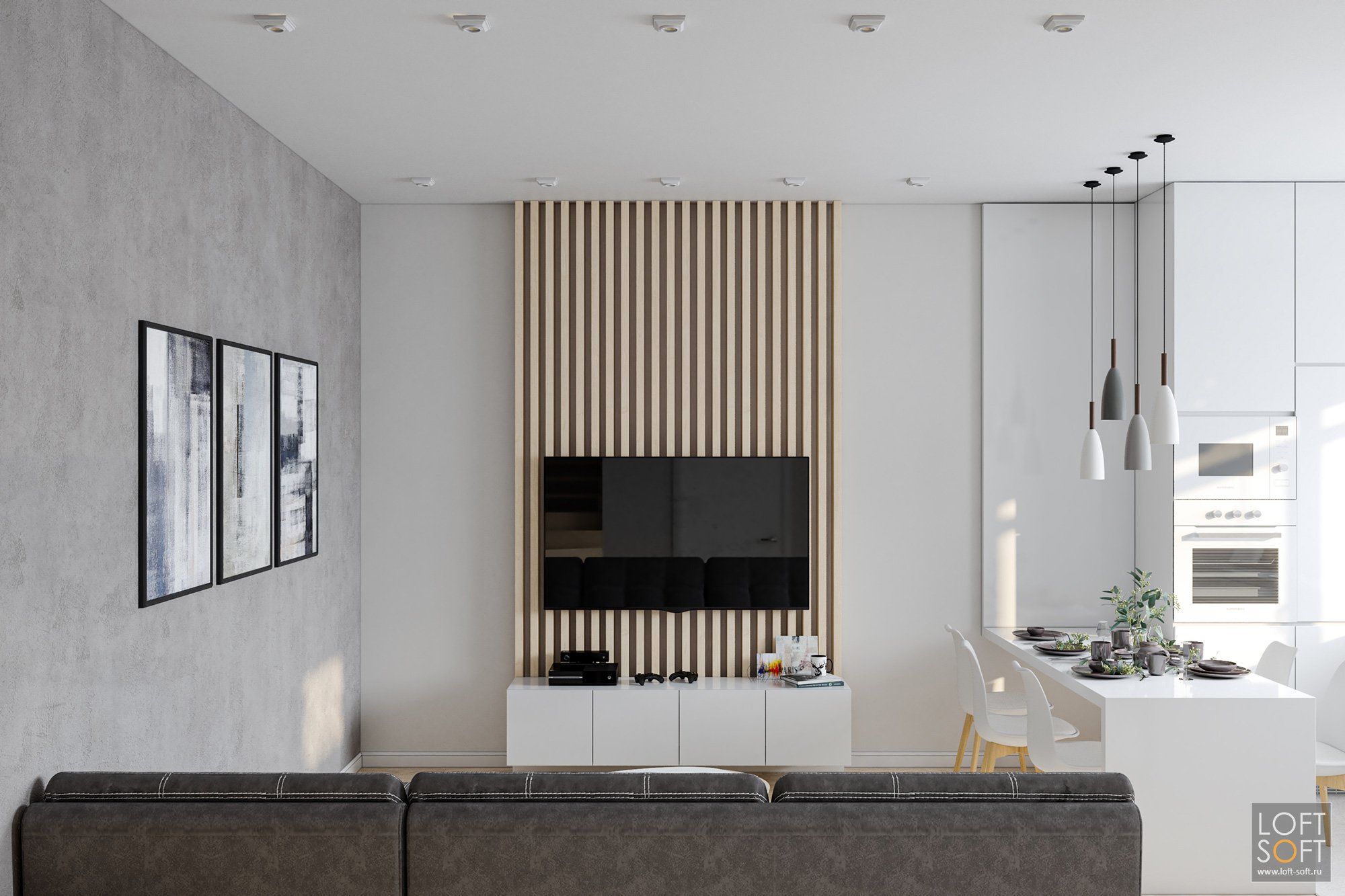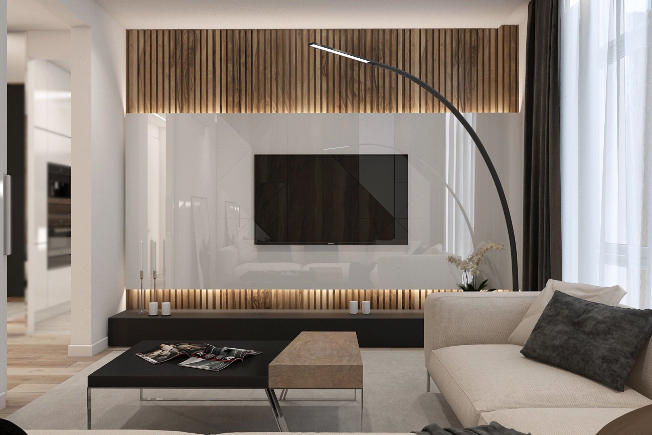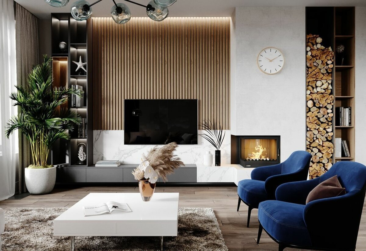 Гостиная в современном стиле с рейками