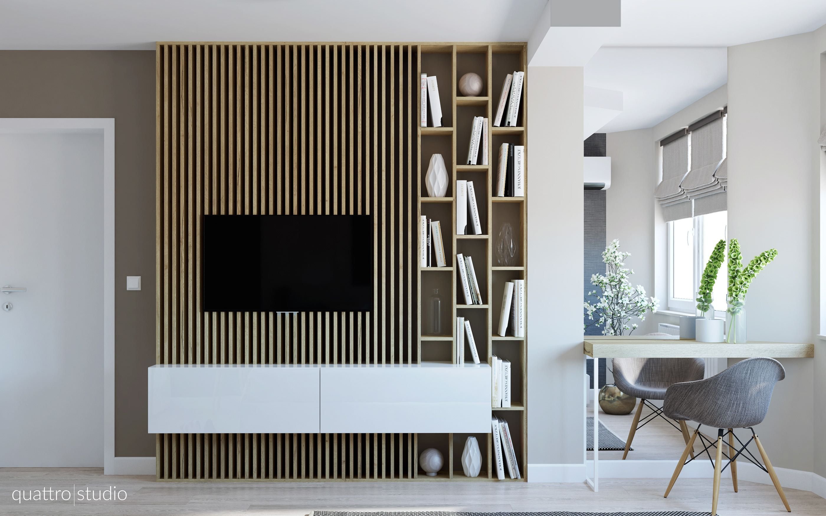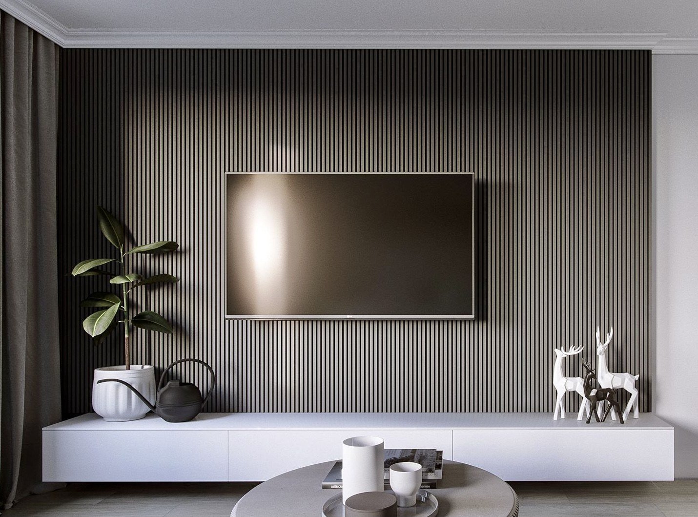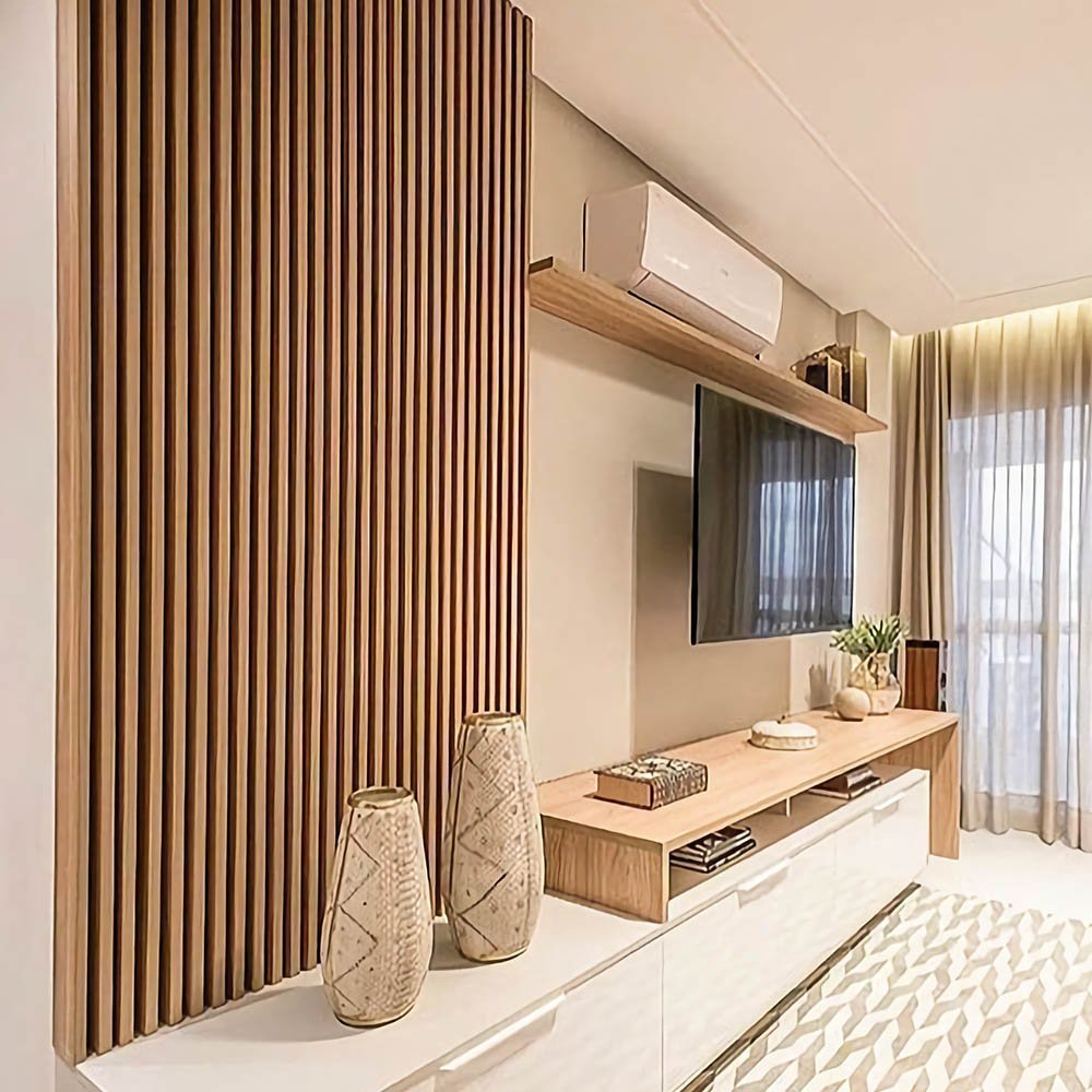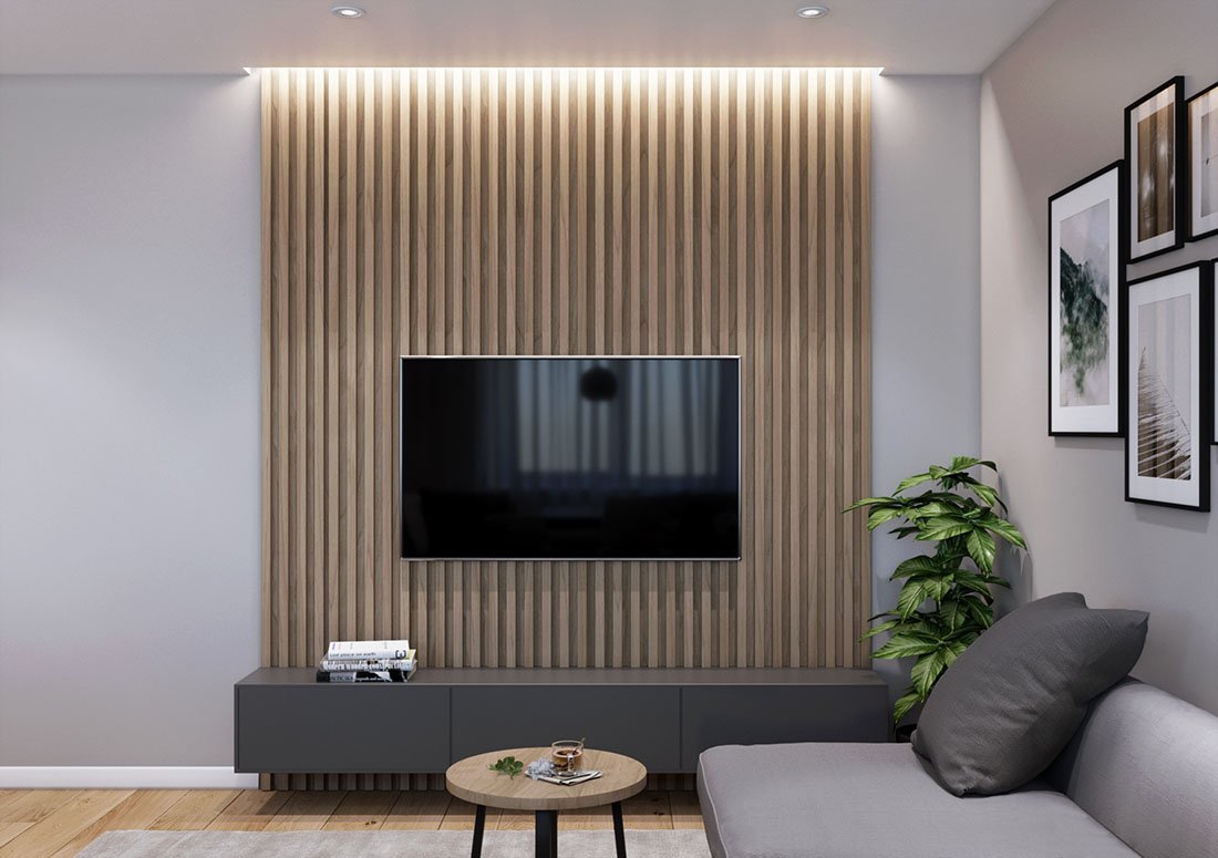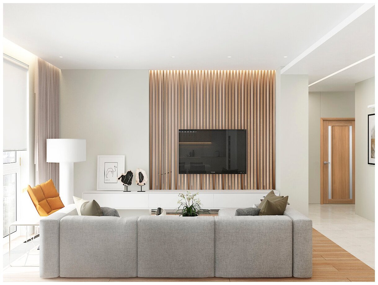Деревянные рейки в гостиной за телевизором