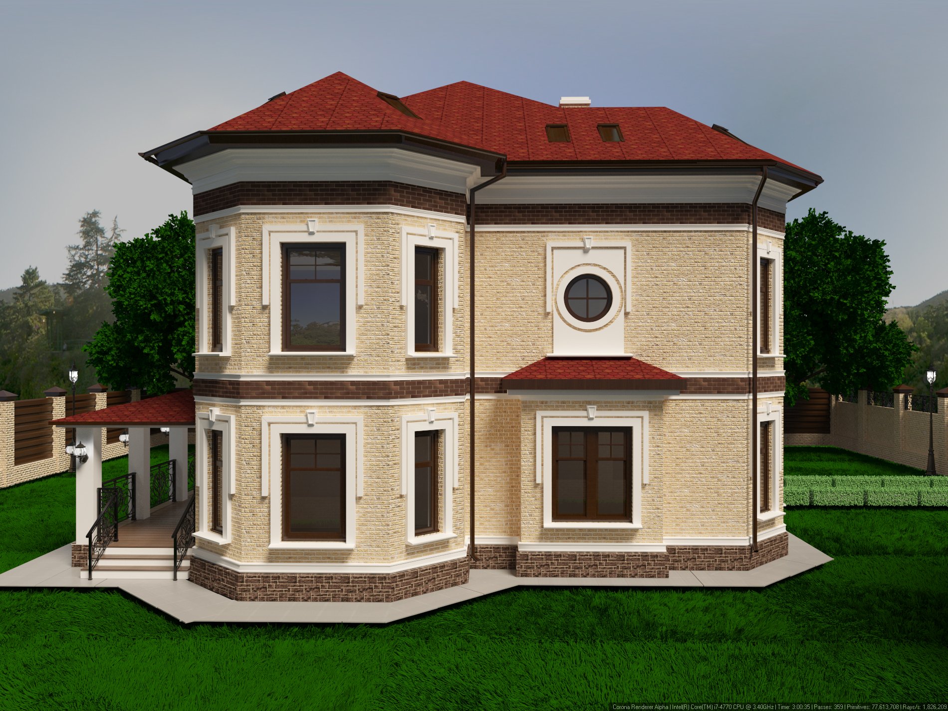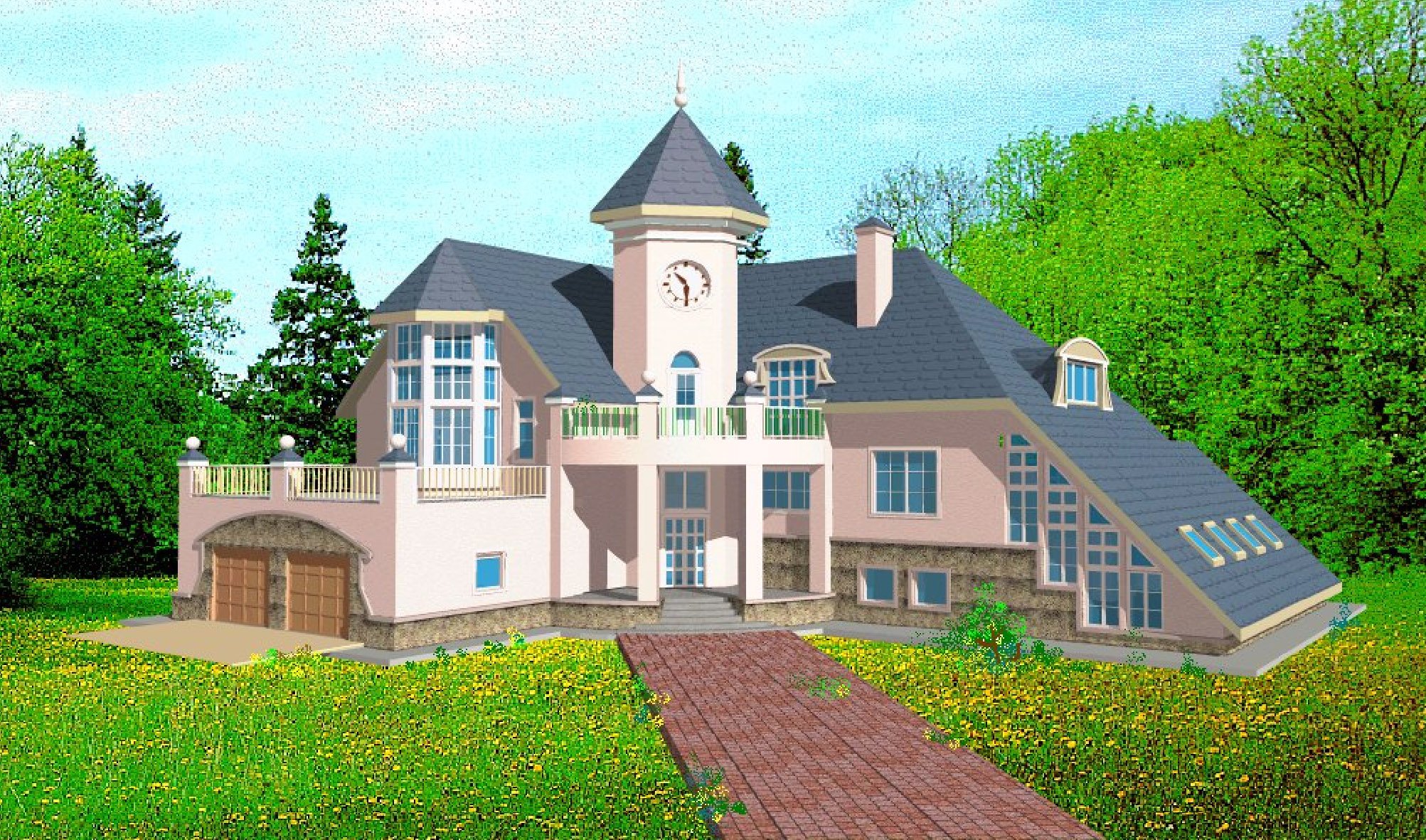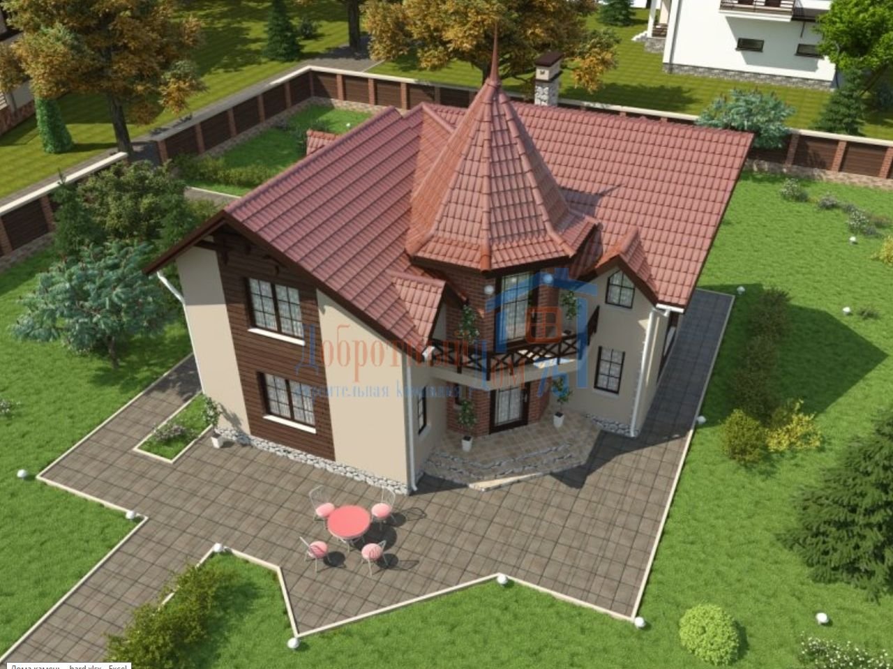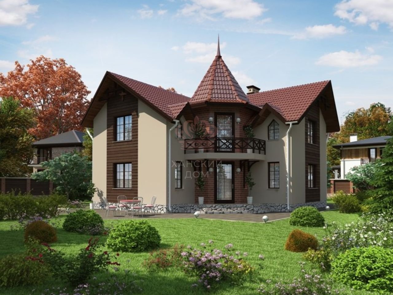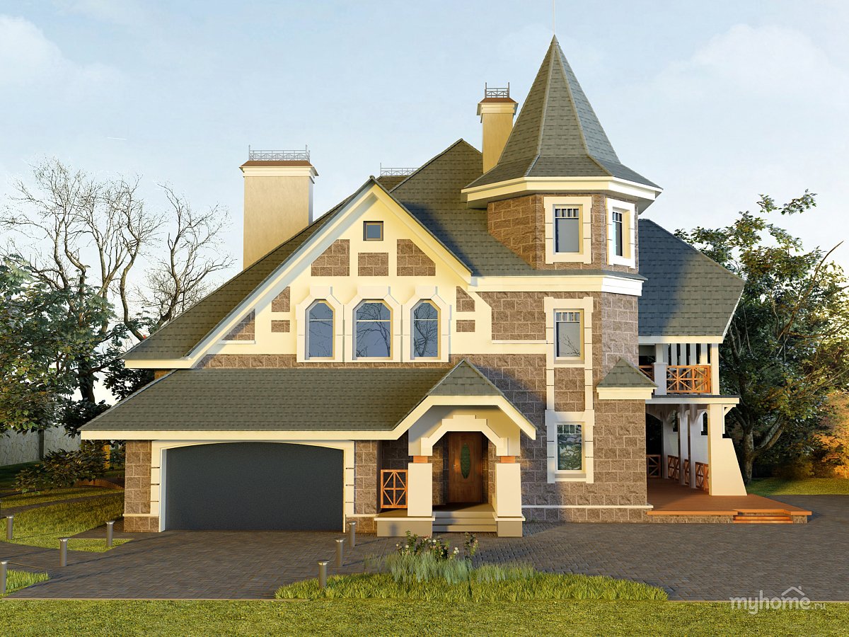 Двухэтажный угловой дом с башней