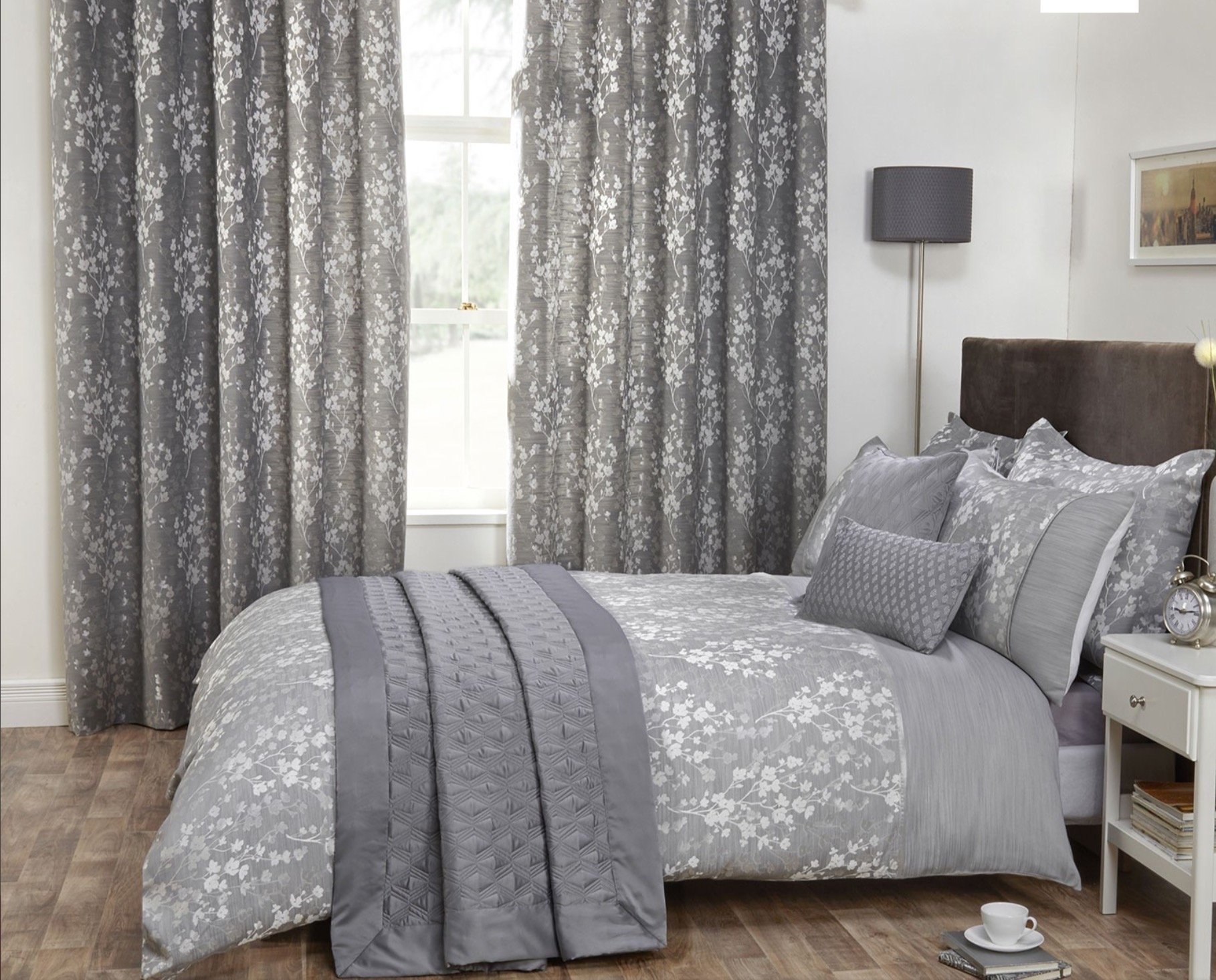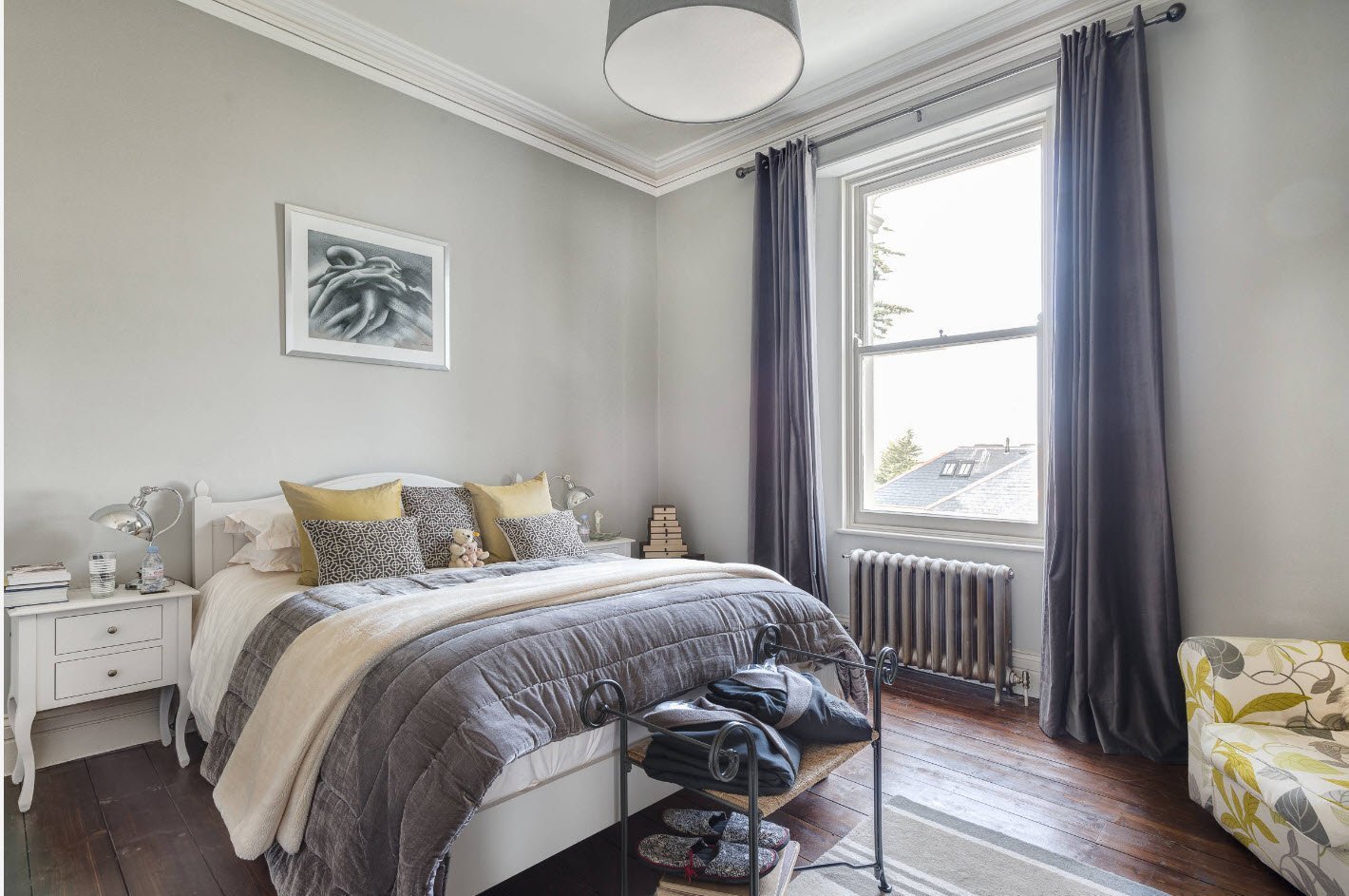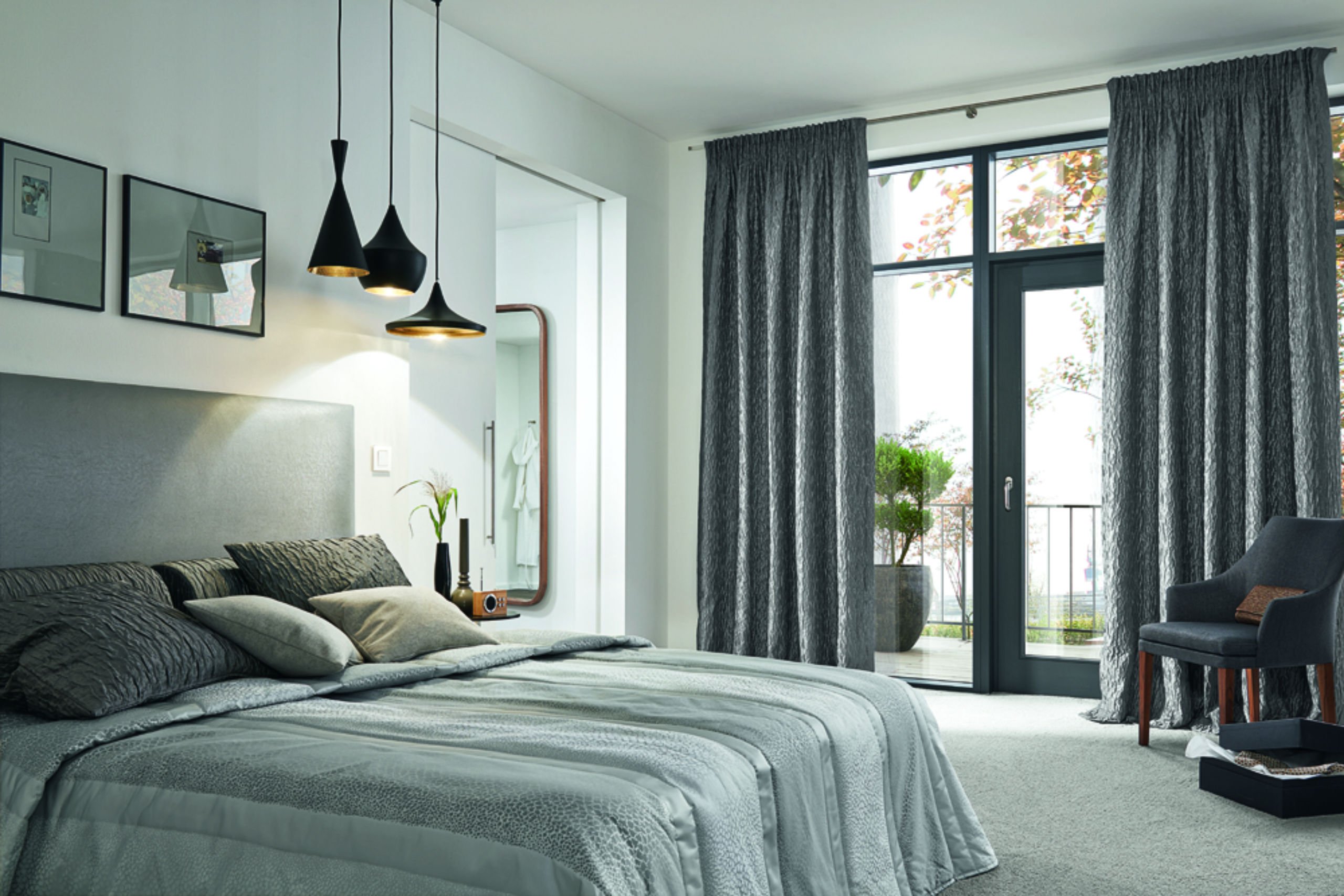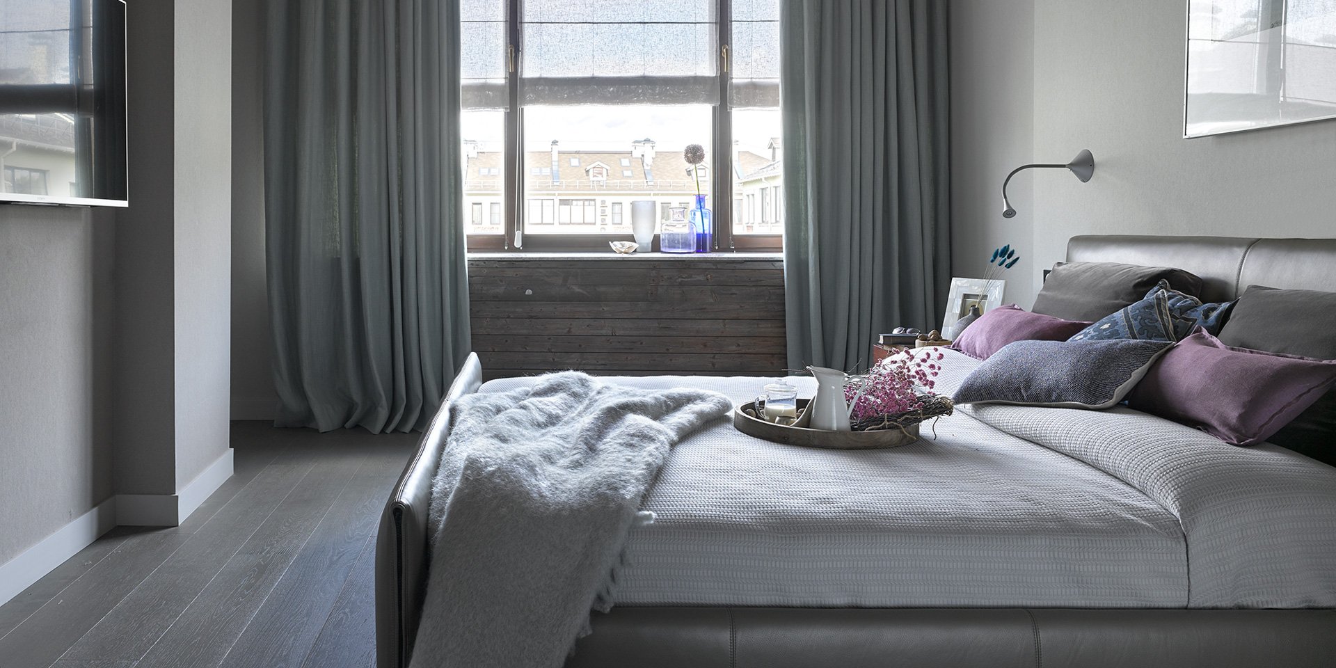 Шторы в спальню с серыми стенами