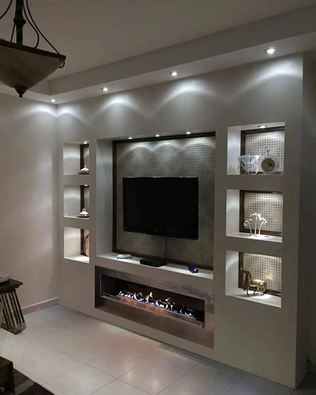 Стенка из гипсокартона под телевизор с камином