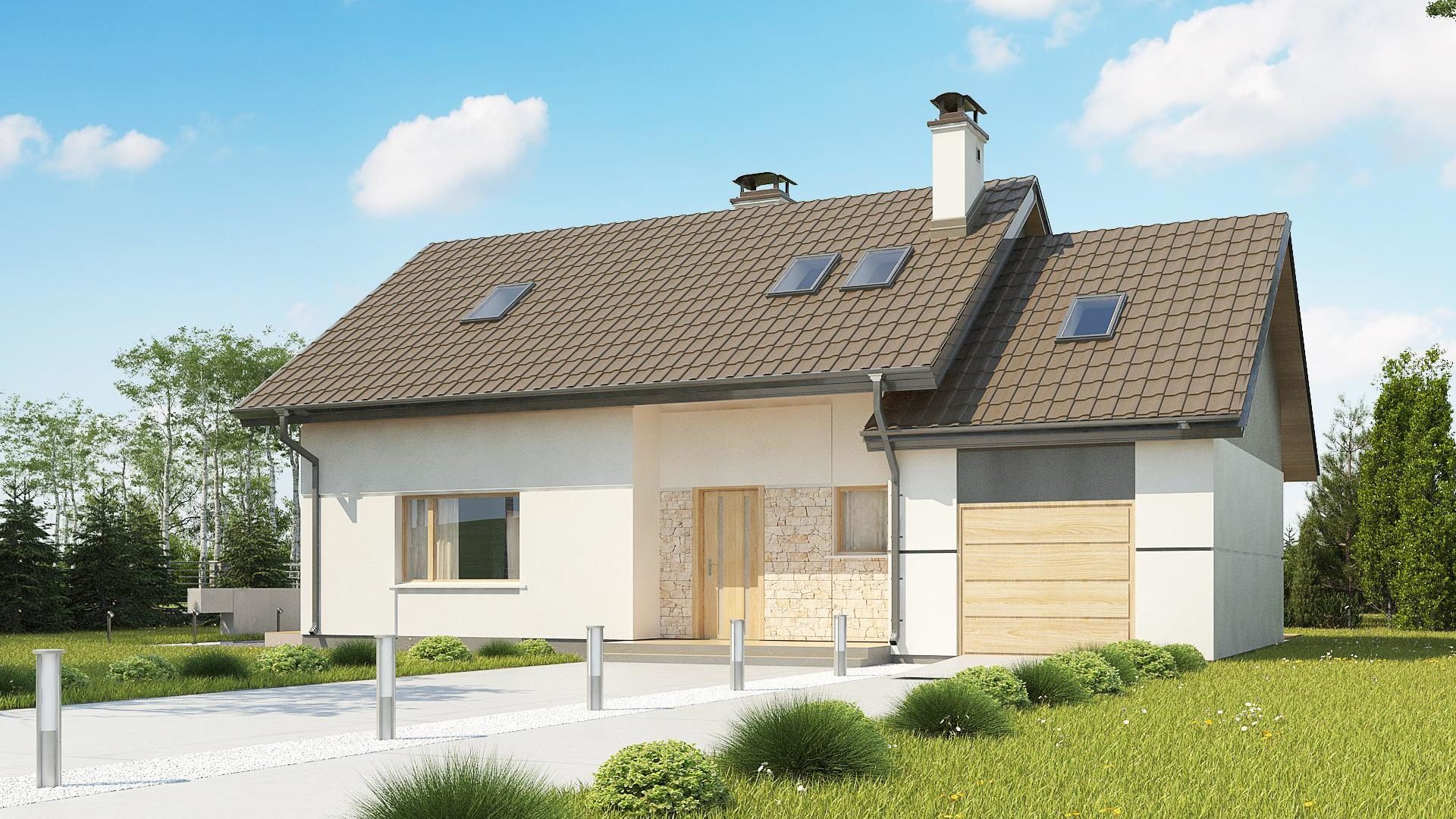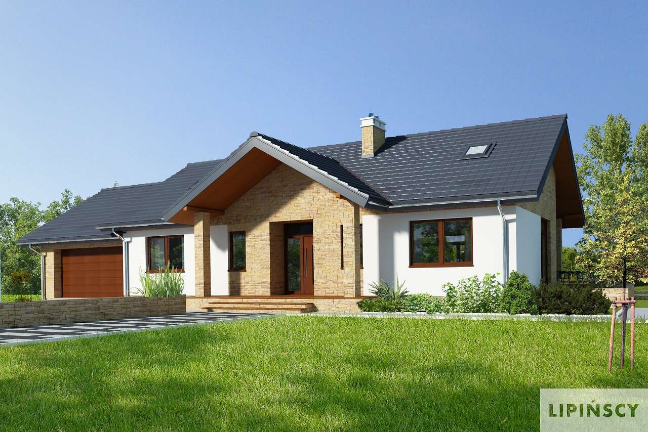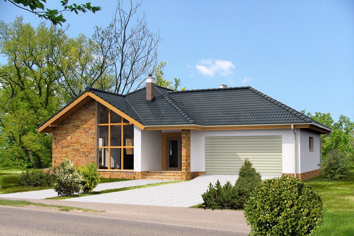 Одноэтажный дом с двухскатной крышей и гаражом