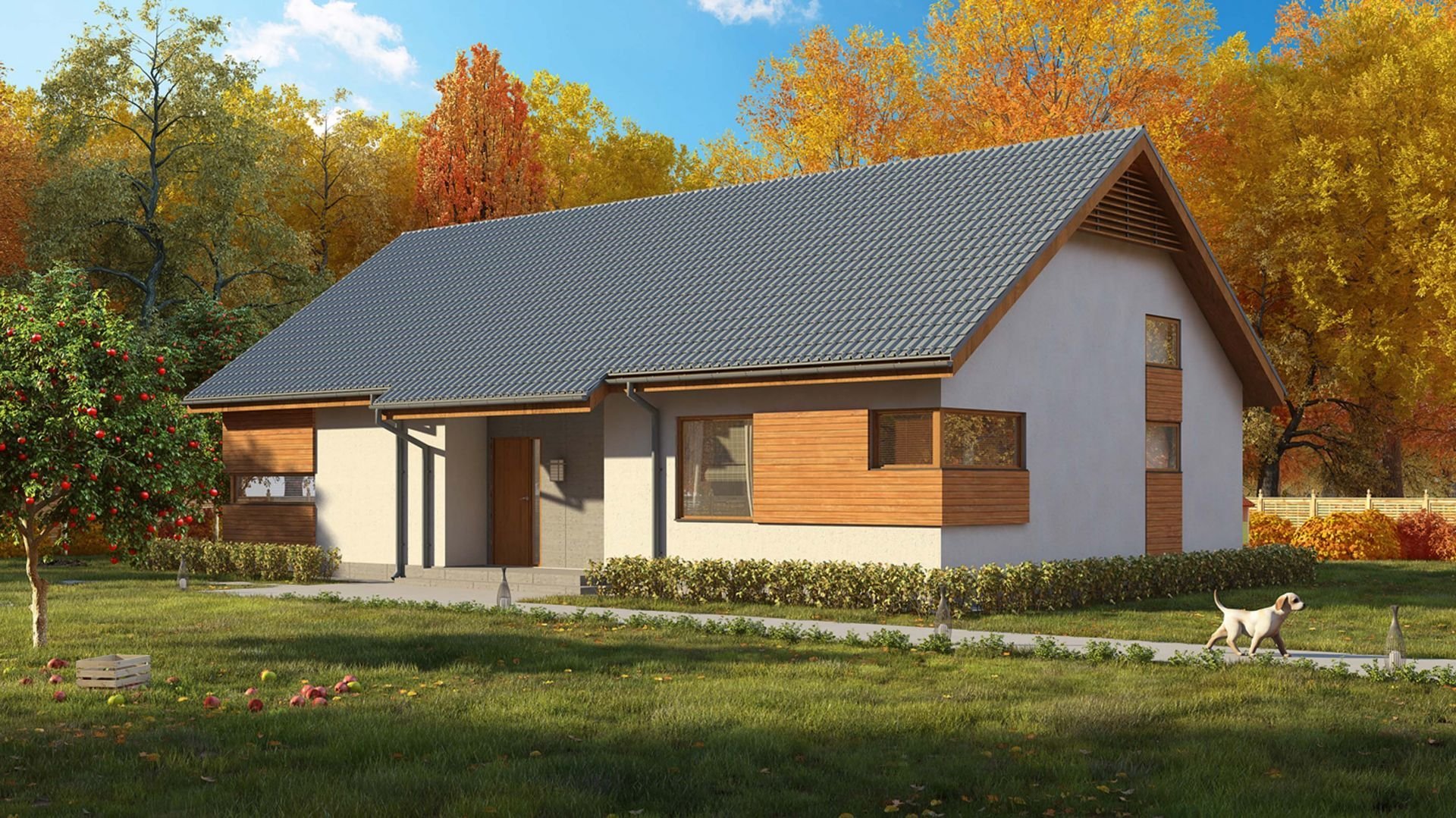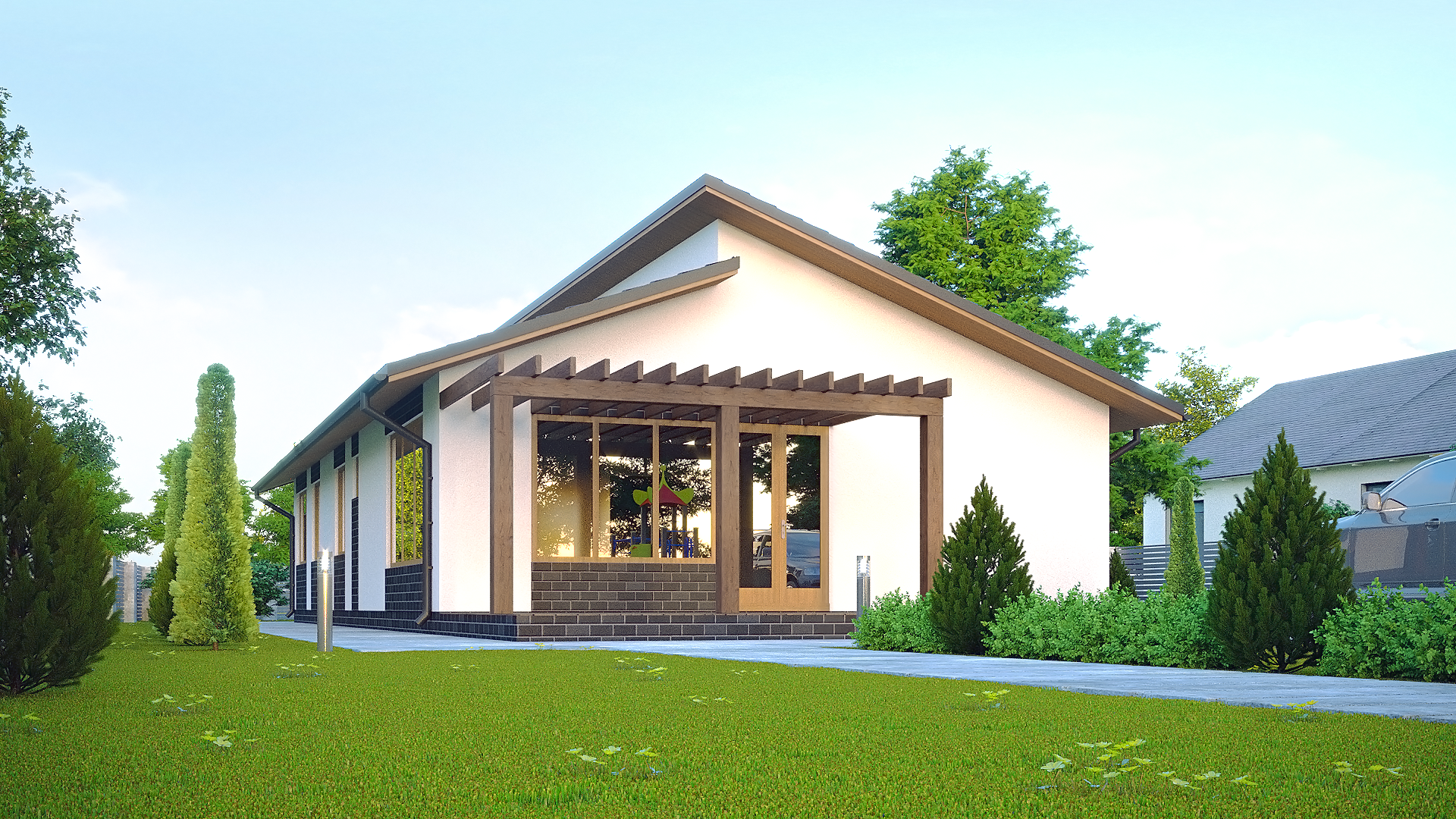 Фасад одноэтажного дома с двускатной крышей