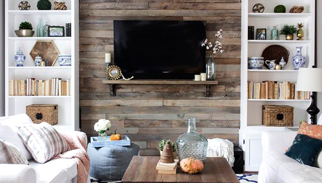 Декор стены в гостиной деревом