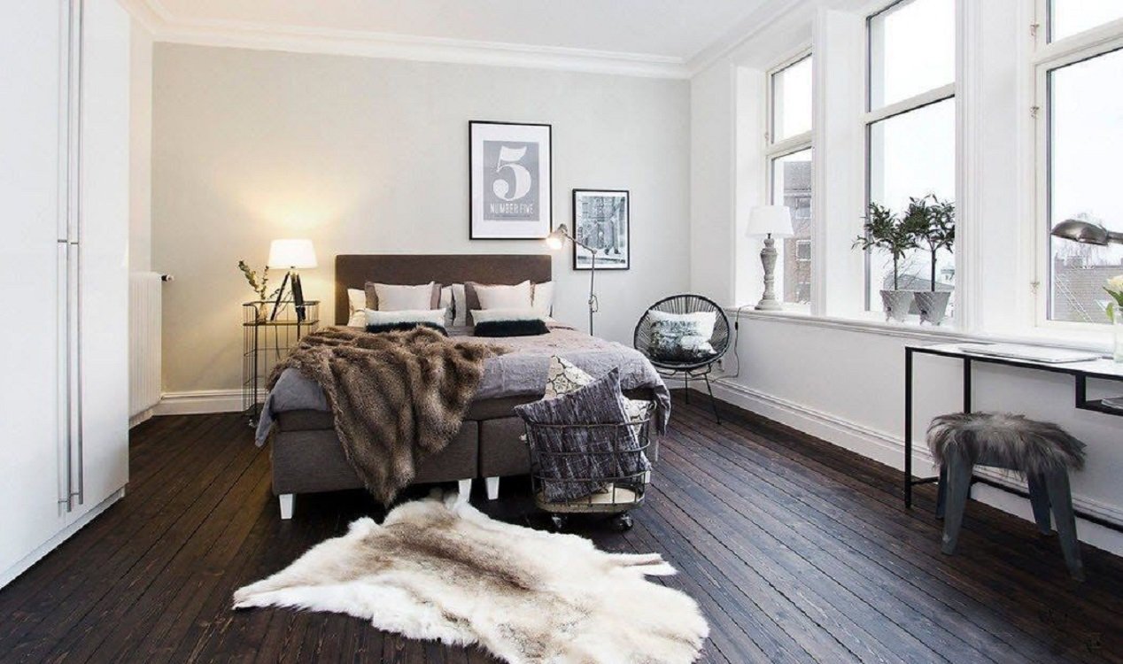 Сканди с темным полом спальня