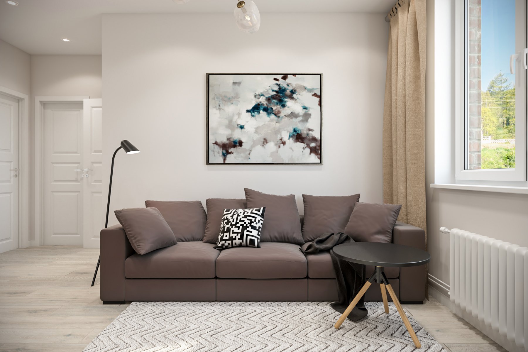 Серый пол и бежевая мебель