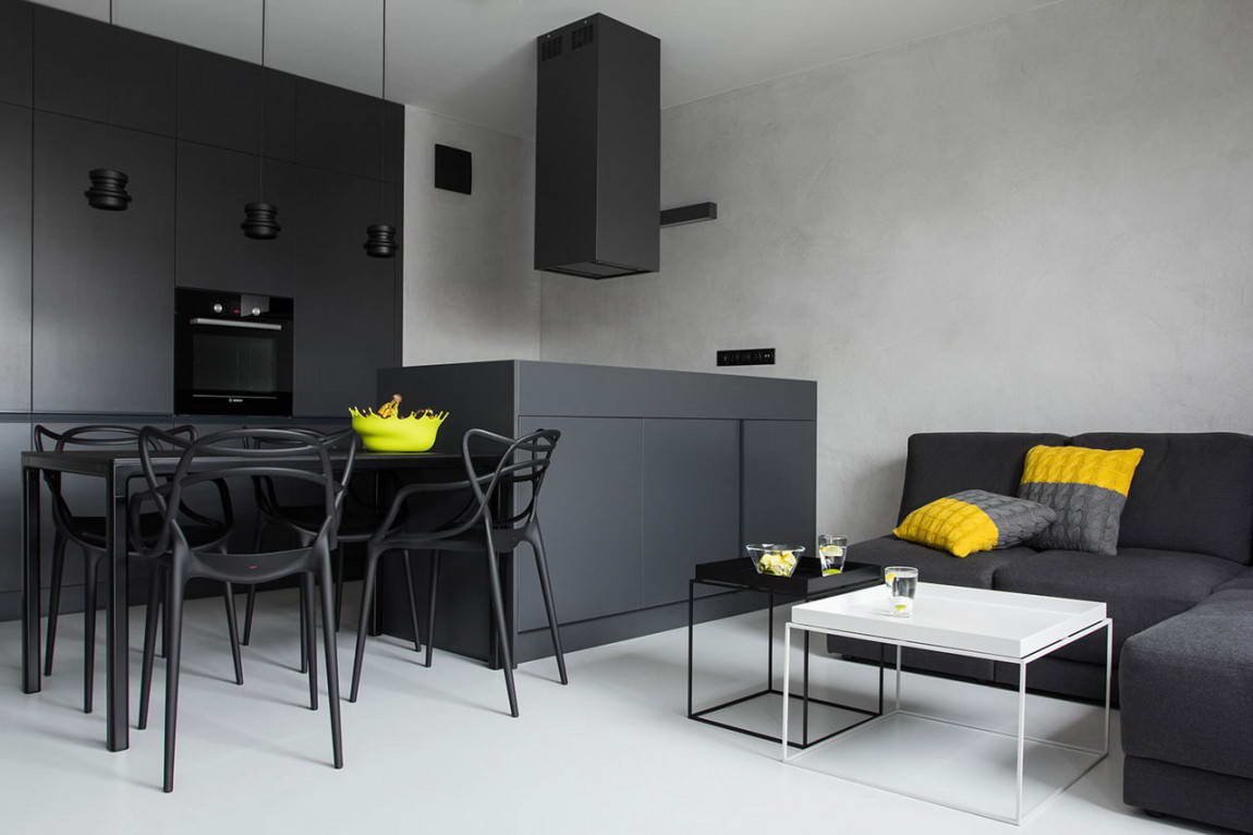 Гостиная с черными стенами и белыми стенами контраст