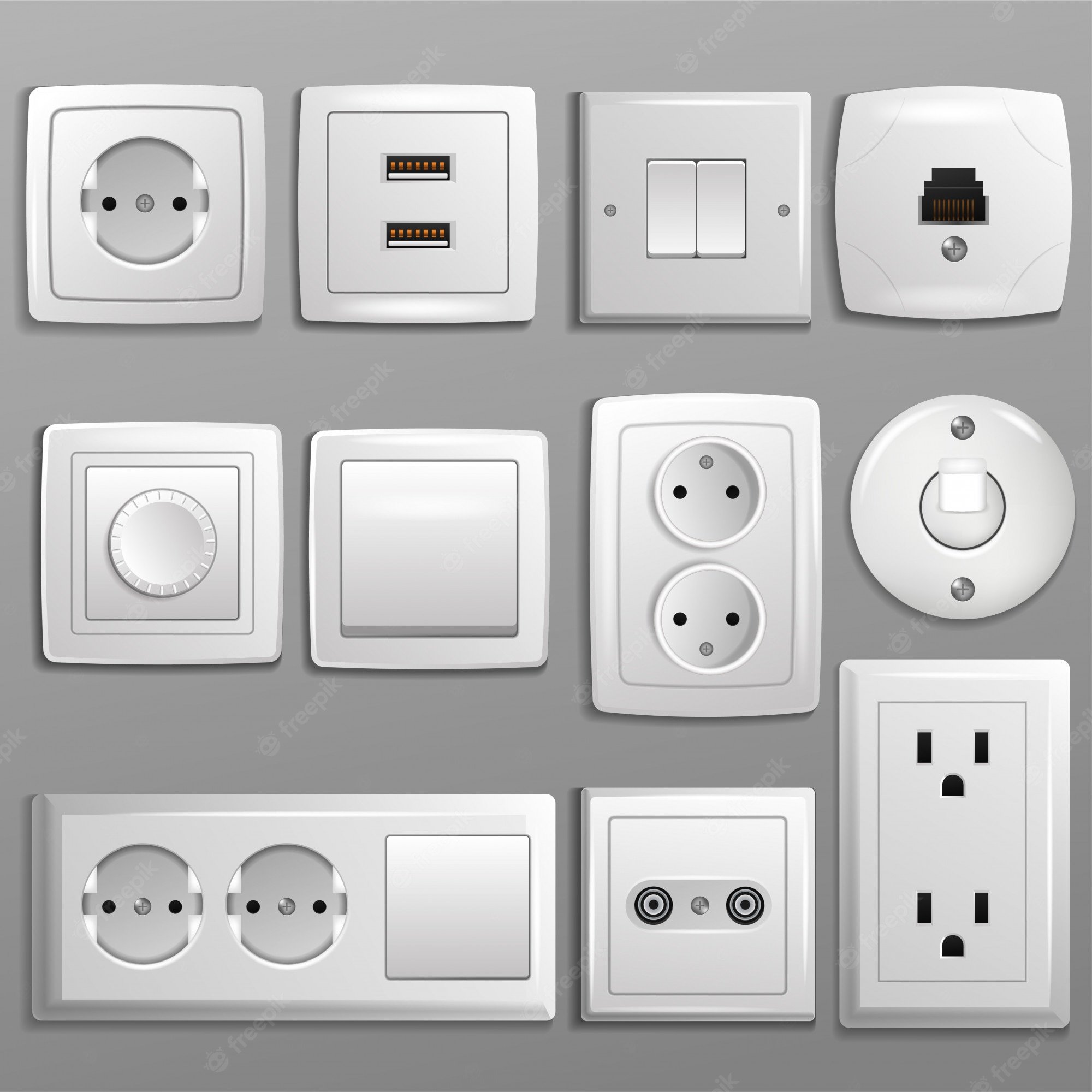 Белые розетки и выключатели на серой стене
