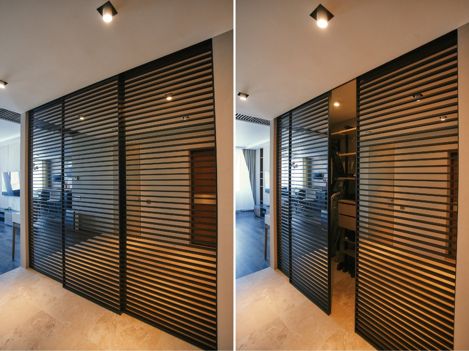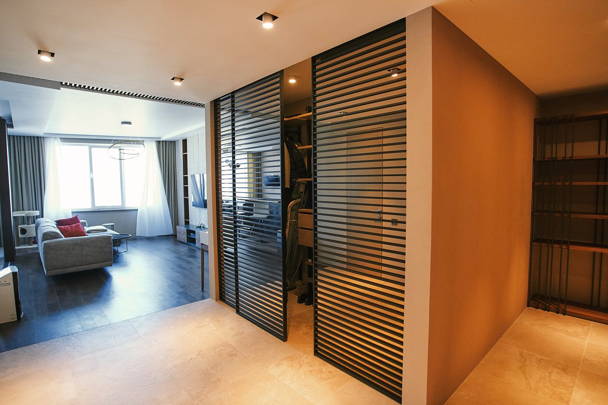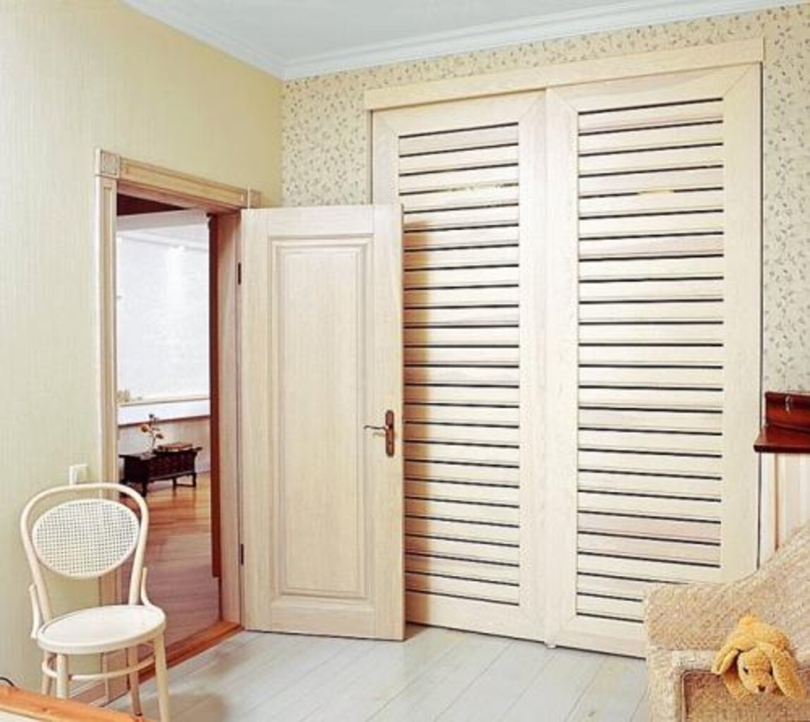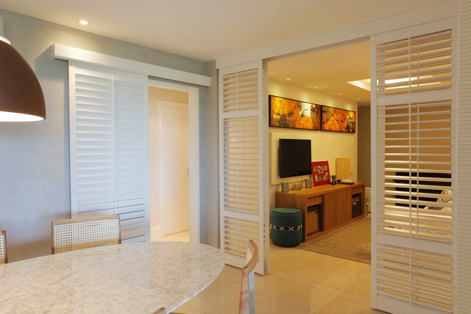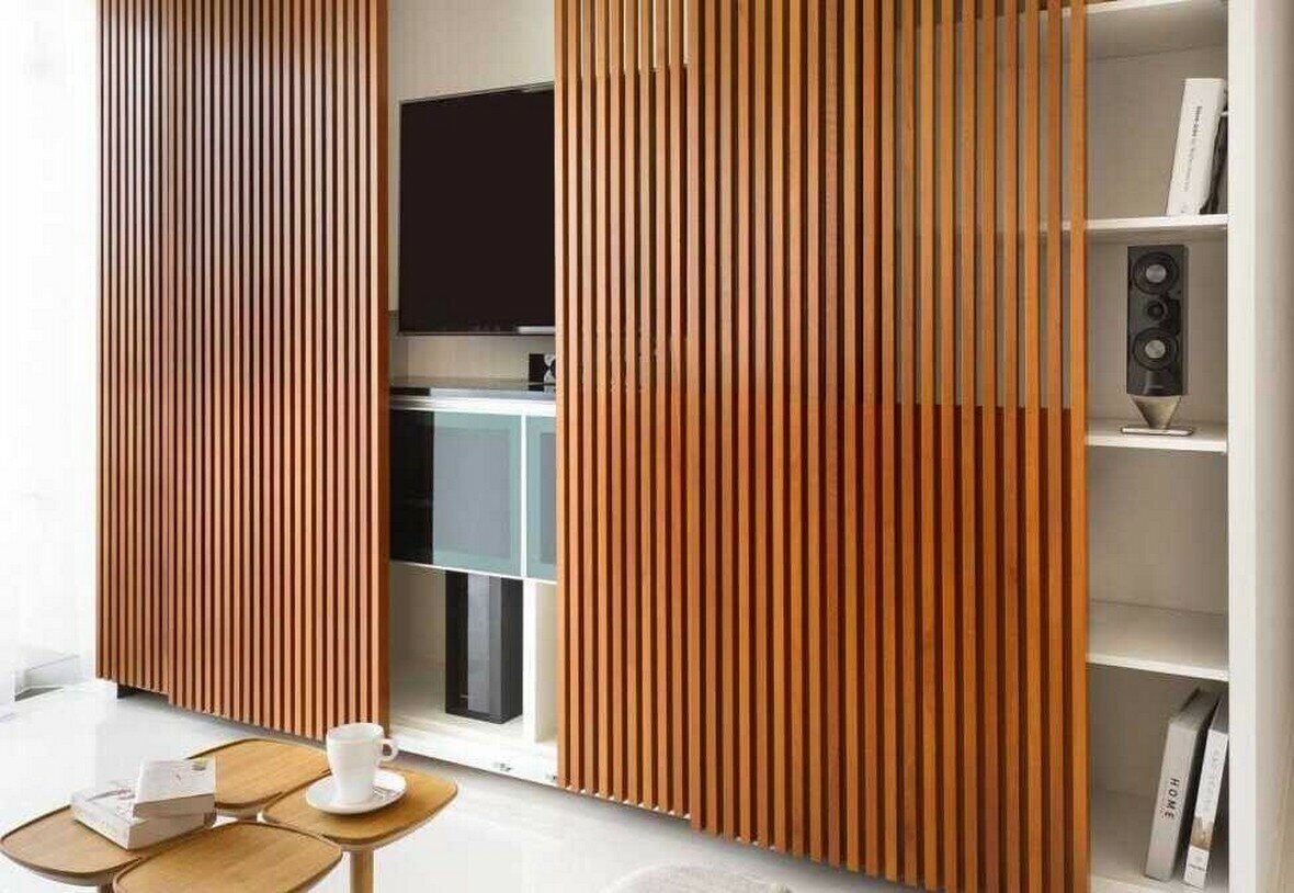 Жалюзийные дверцы в гостиной с местом под ТВ