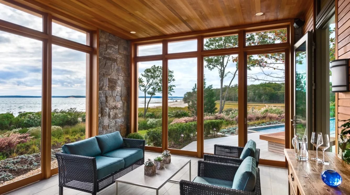 Летняя веранда с панорамными окнами в дорогом доме