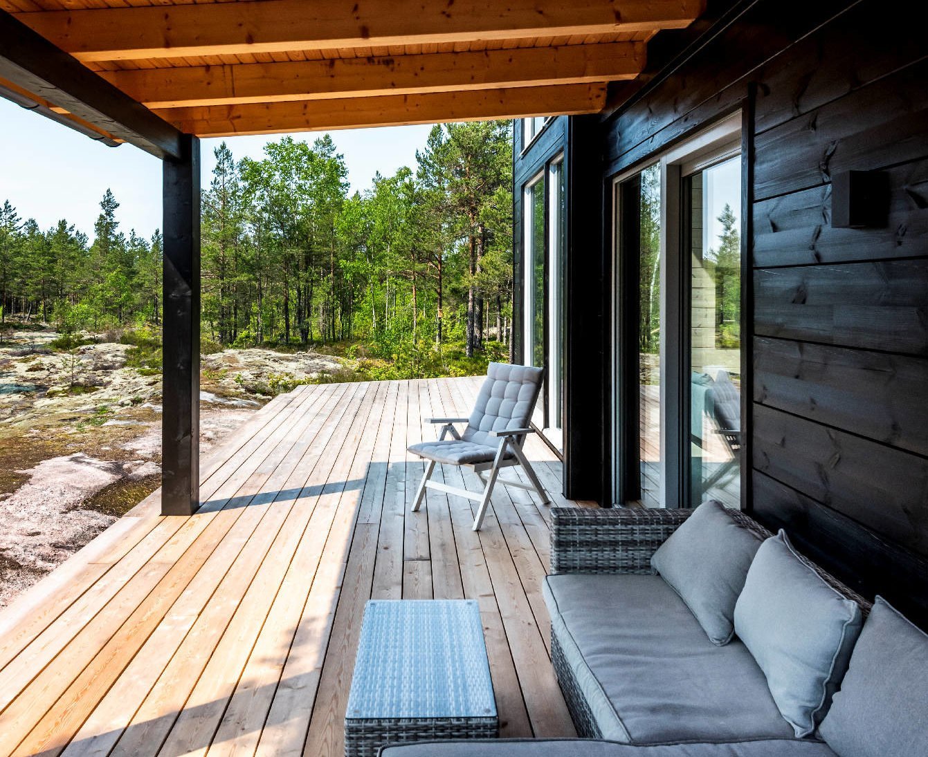 Веранда к дачному деревянному дому с панорамными окнами