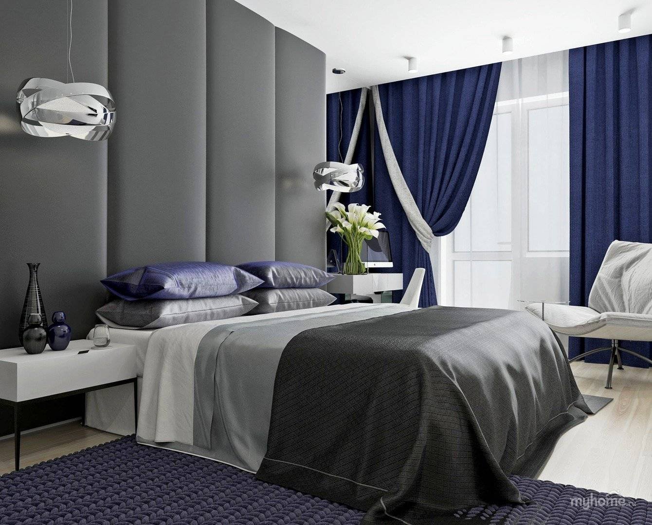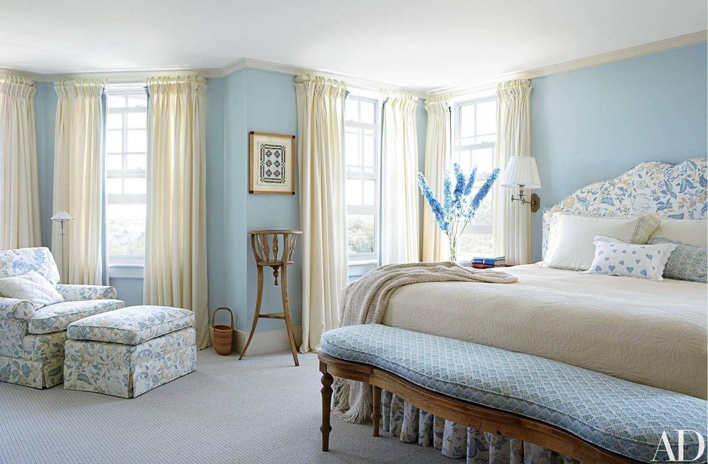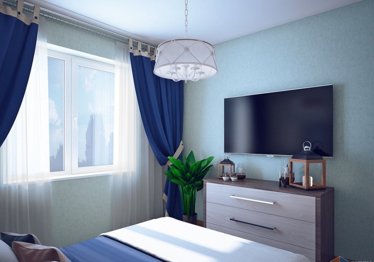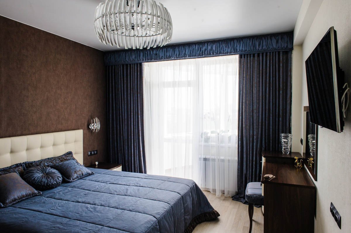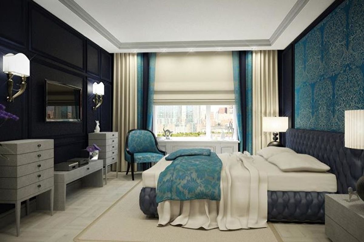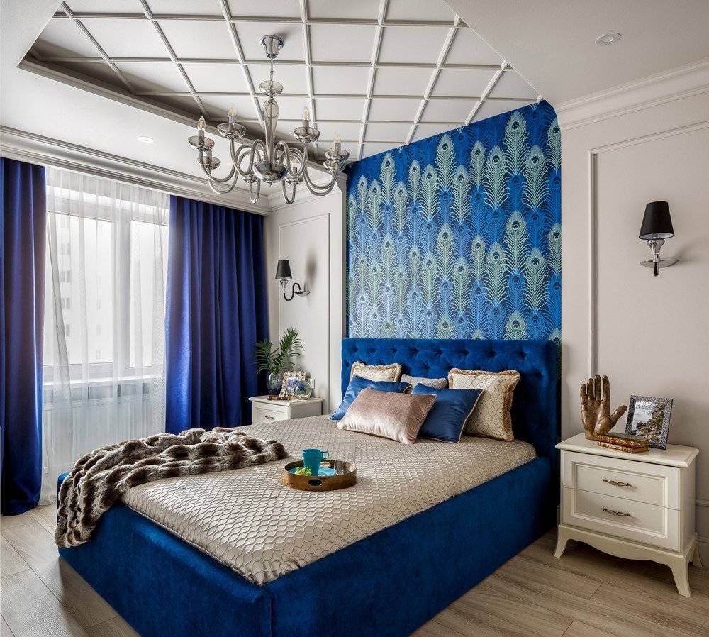 Синие шторы в интерьере спальни