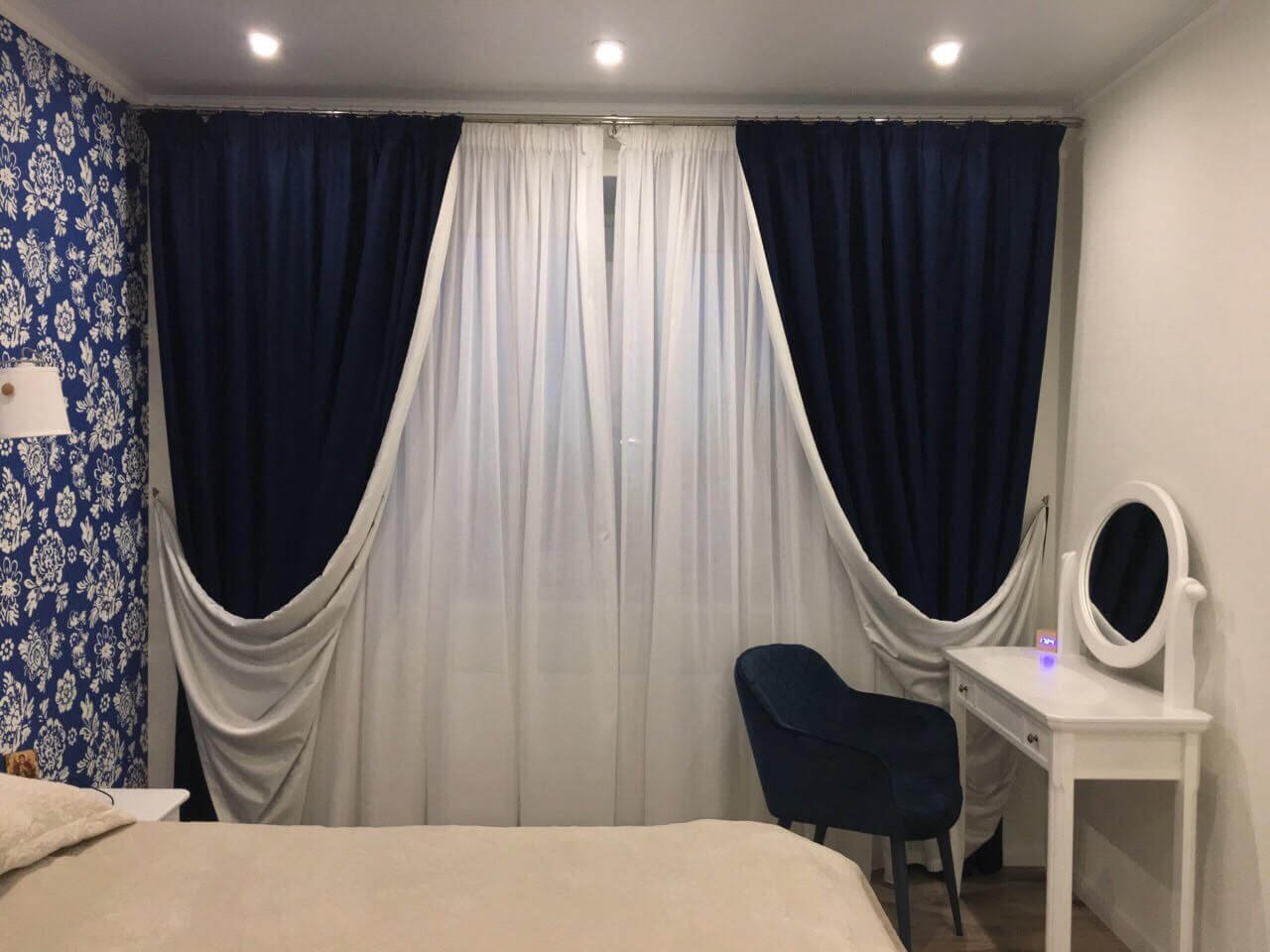 Темно синие шторы в спальне