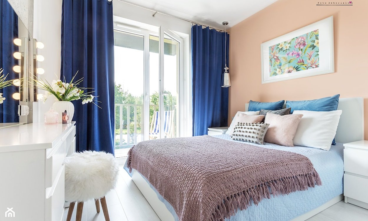 Пудровые шторы в интерьере с синими стенами
